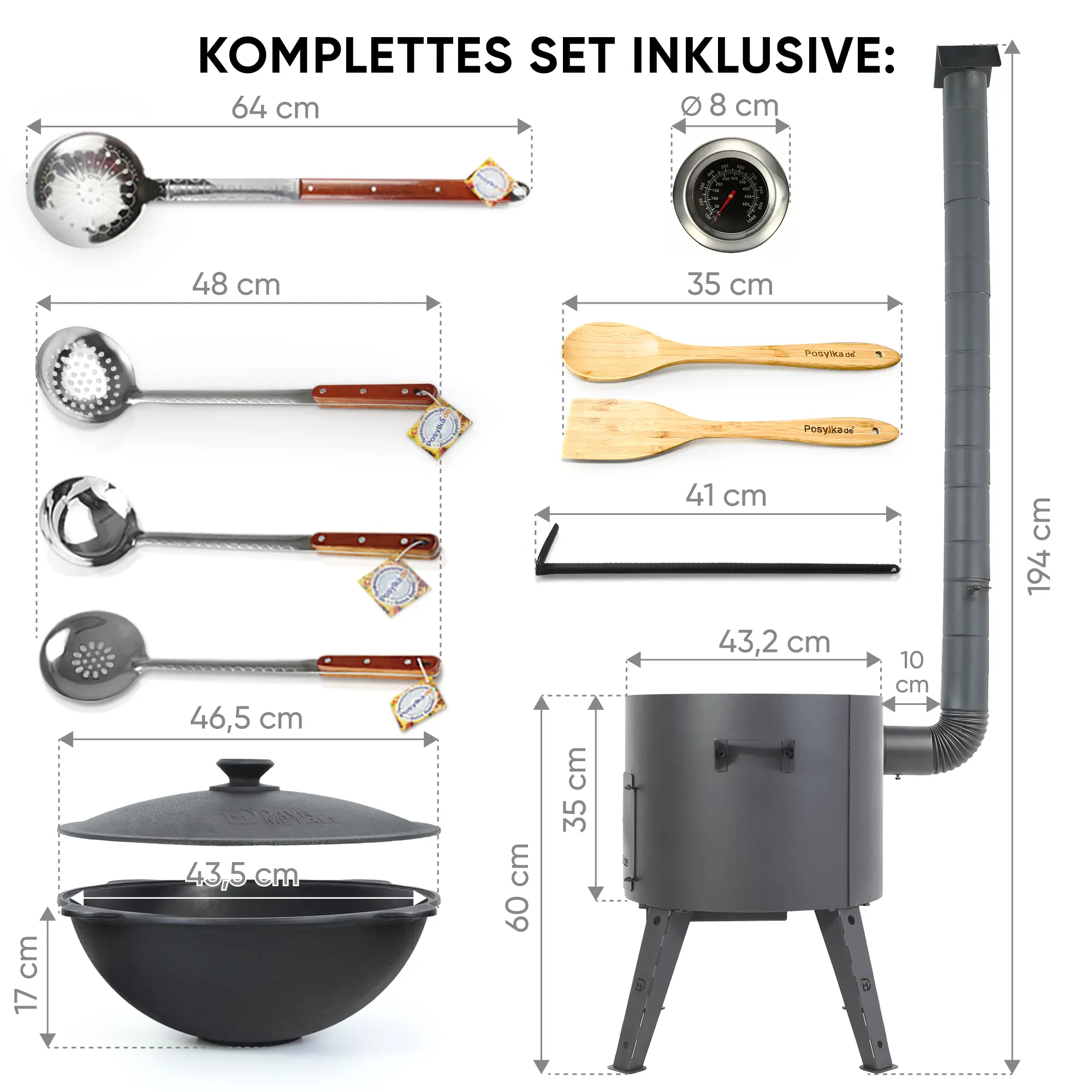 Utschak Feuerofen Ø 44 cm + Gusseisen-Kasan 16 l, Ø 46,5 cm, flacher Boden + Küchenzubehör, Usbekischer Kochtopf aus Gusseisen