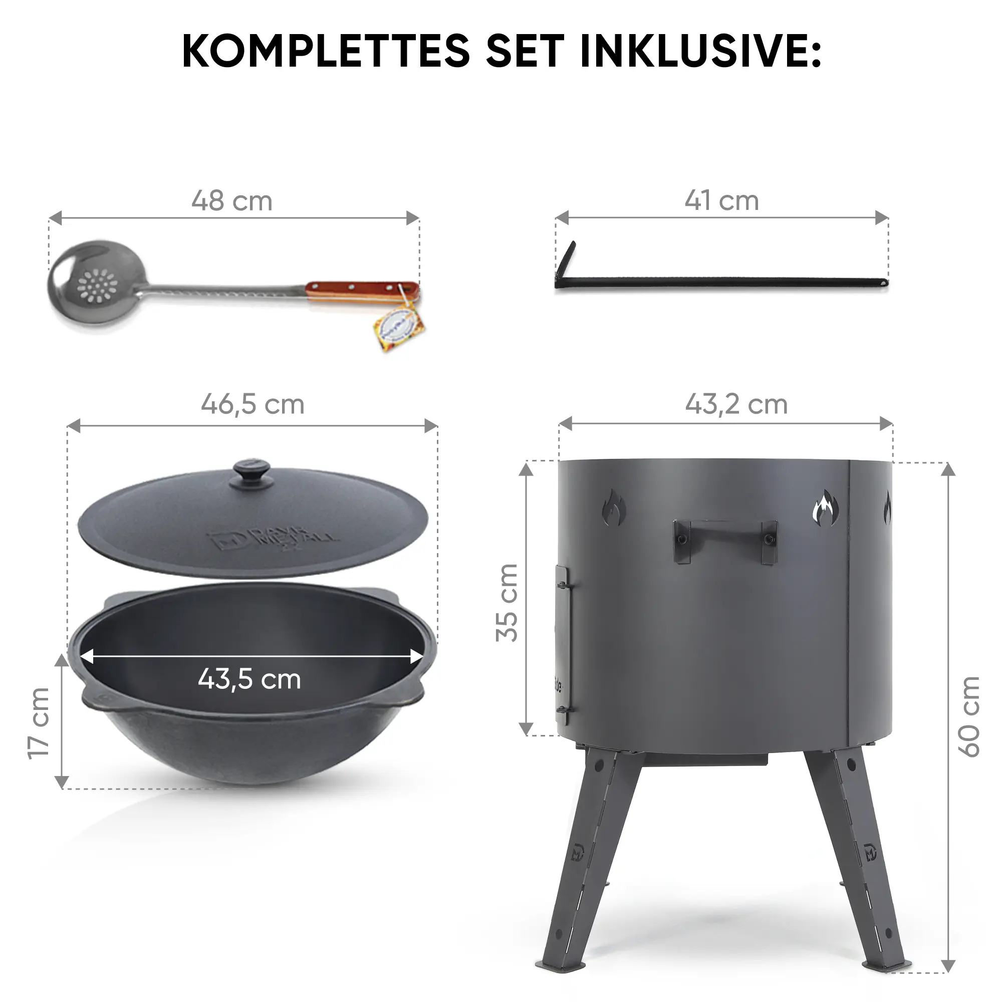 Utschak Feuerofen Ø 44 cm + Gusseisen-Kasan 16 l, Ø 46,5 cm, runder Boden + Küchenzubehör, Usbekischer Kochtopf aus Gusseisen