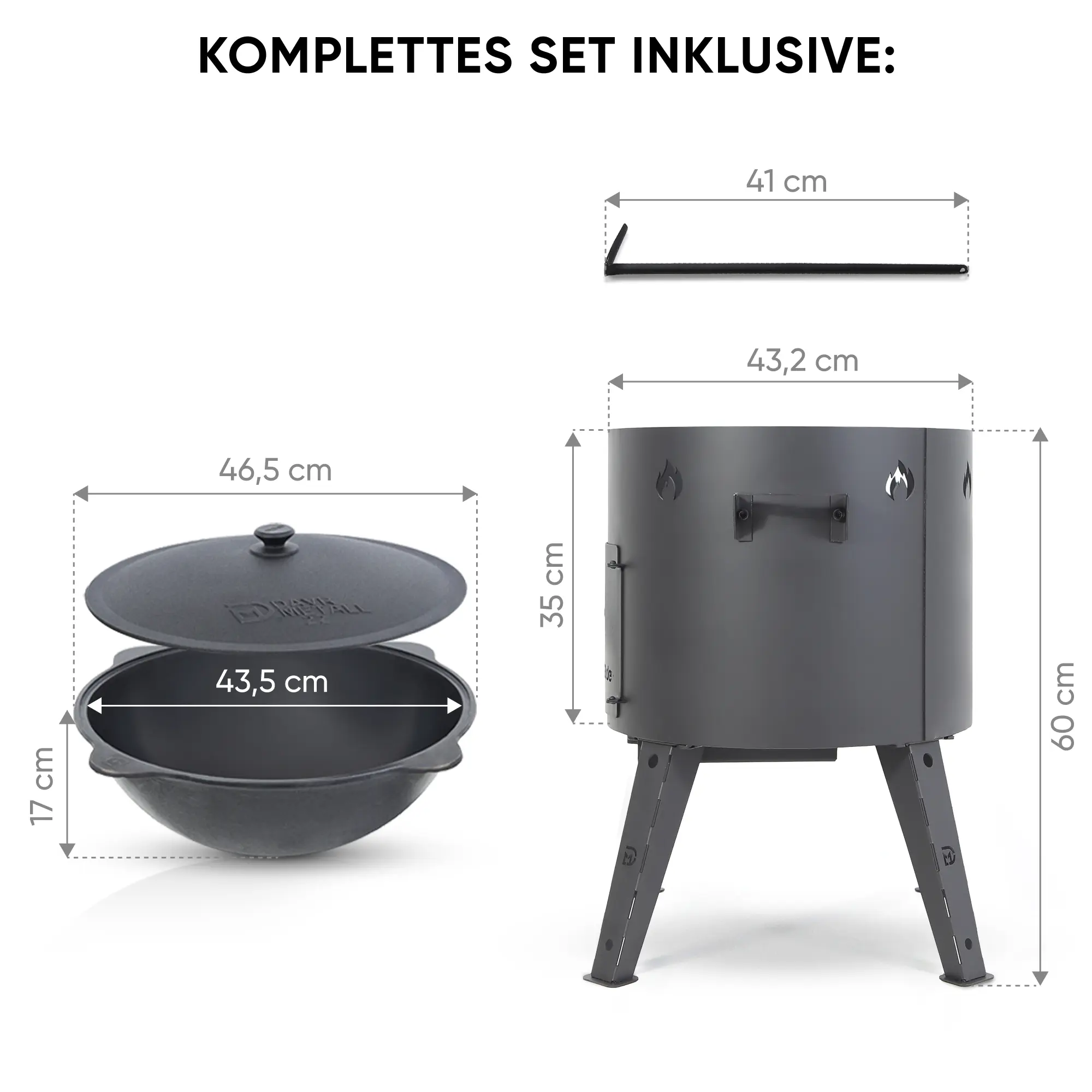 Utschak Feuerofen Ø 44 cm + Gusseisen-Kasan 16 l, Ø 46,5 cm, runder Boden + Küchenzubehör, Usbekischer Kochtopf aus Gusseisen