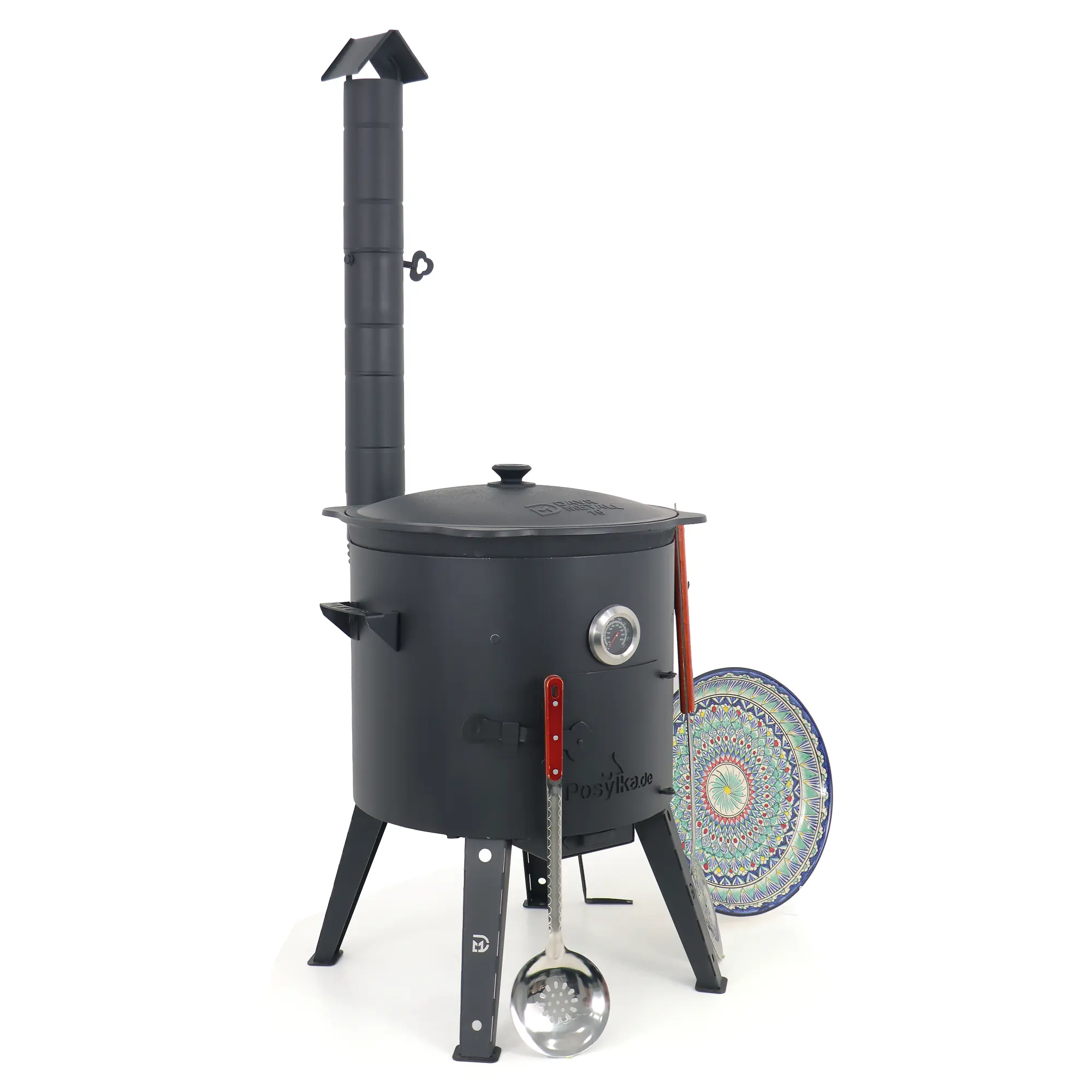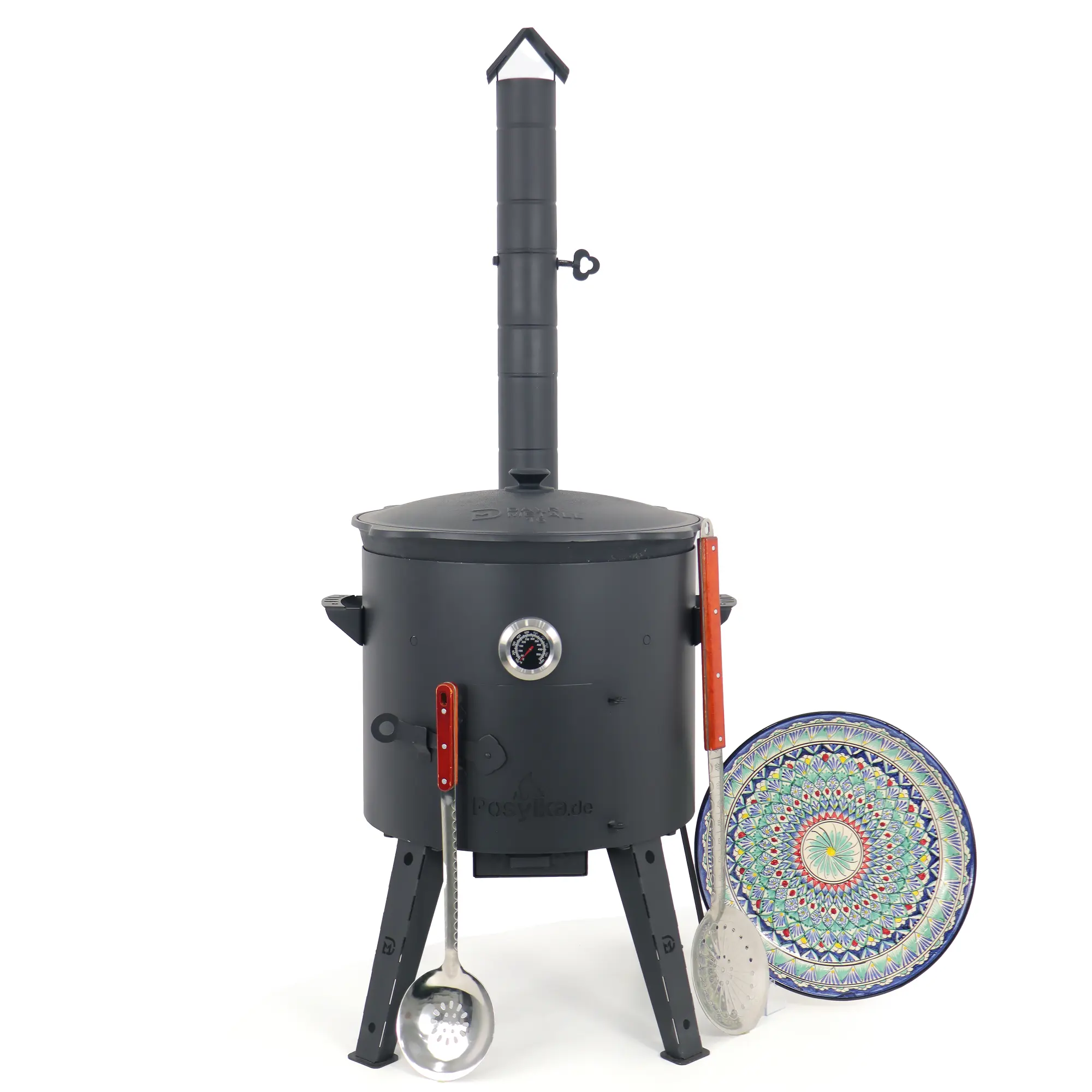 Utschak Feuerofen Ø 44 cm + Gusseisen-Kasan 16 l, Ø 46,5 cm, runder Boden + Küchenzubehör, Usbekischer Kochtopf aus Gusseisen