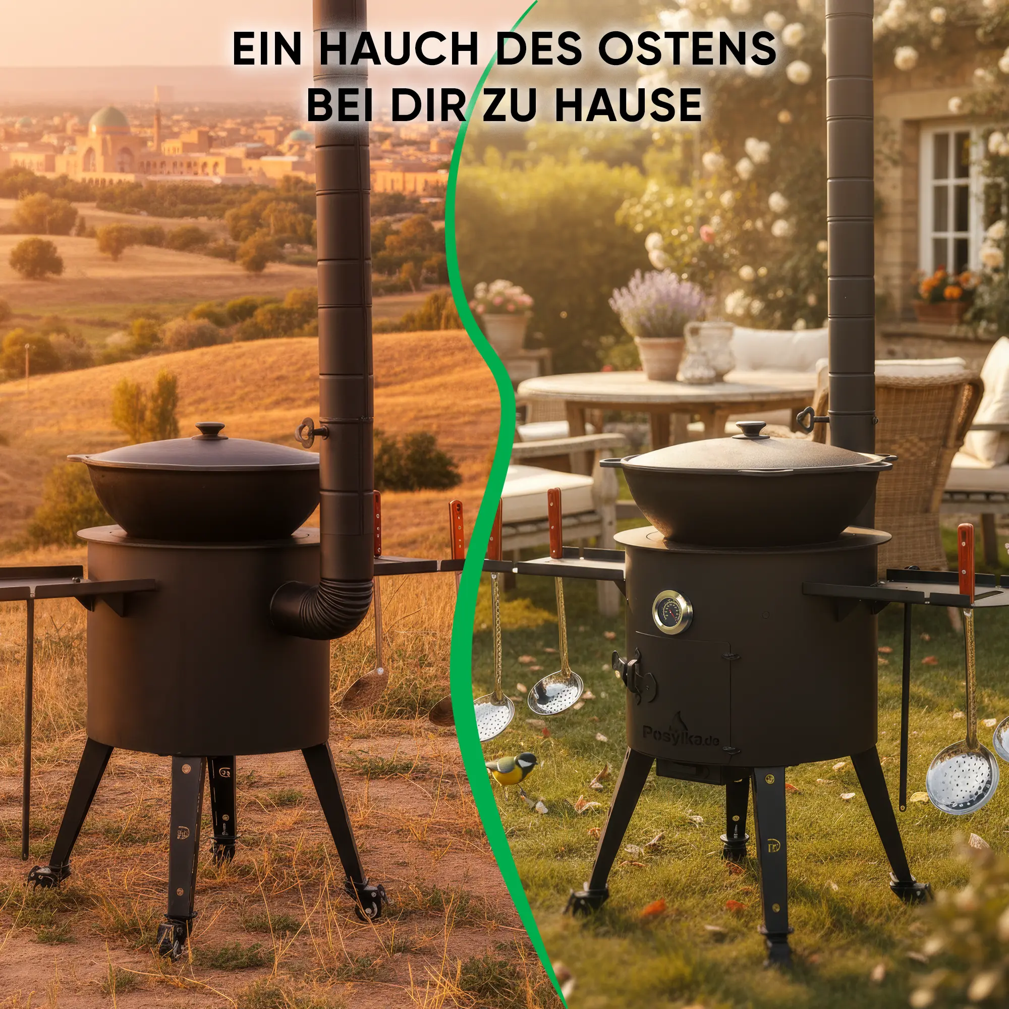 Utschak Feuerofen Ø 44 cm + Gusseisen-Kasan 16 l, flacher Boden + Küchenzubehör, Usbekischer Kochtopf aus Gusseisen