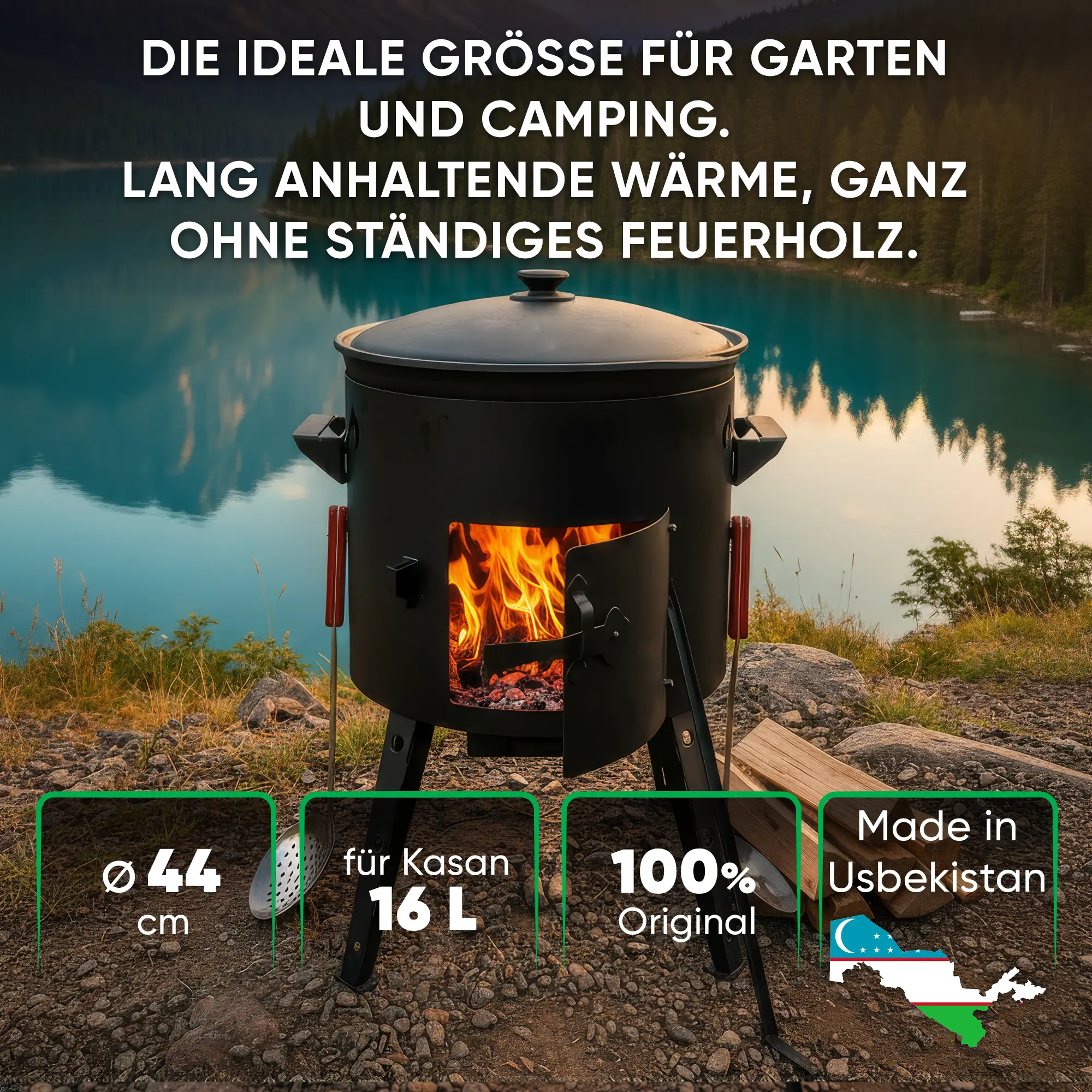 Utschak Feuerofen Ø 44 cm + Gusseisen-Kasan 16 l, flacher Boden + Küchenzubehör, Usbekischer Kochtopf aus Gusseisen