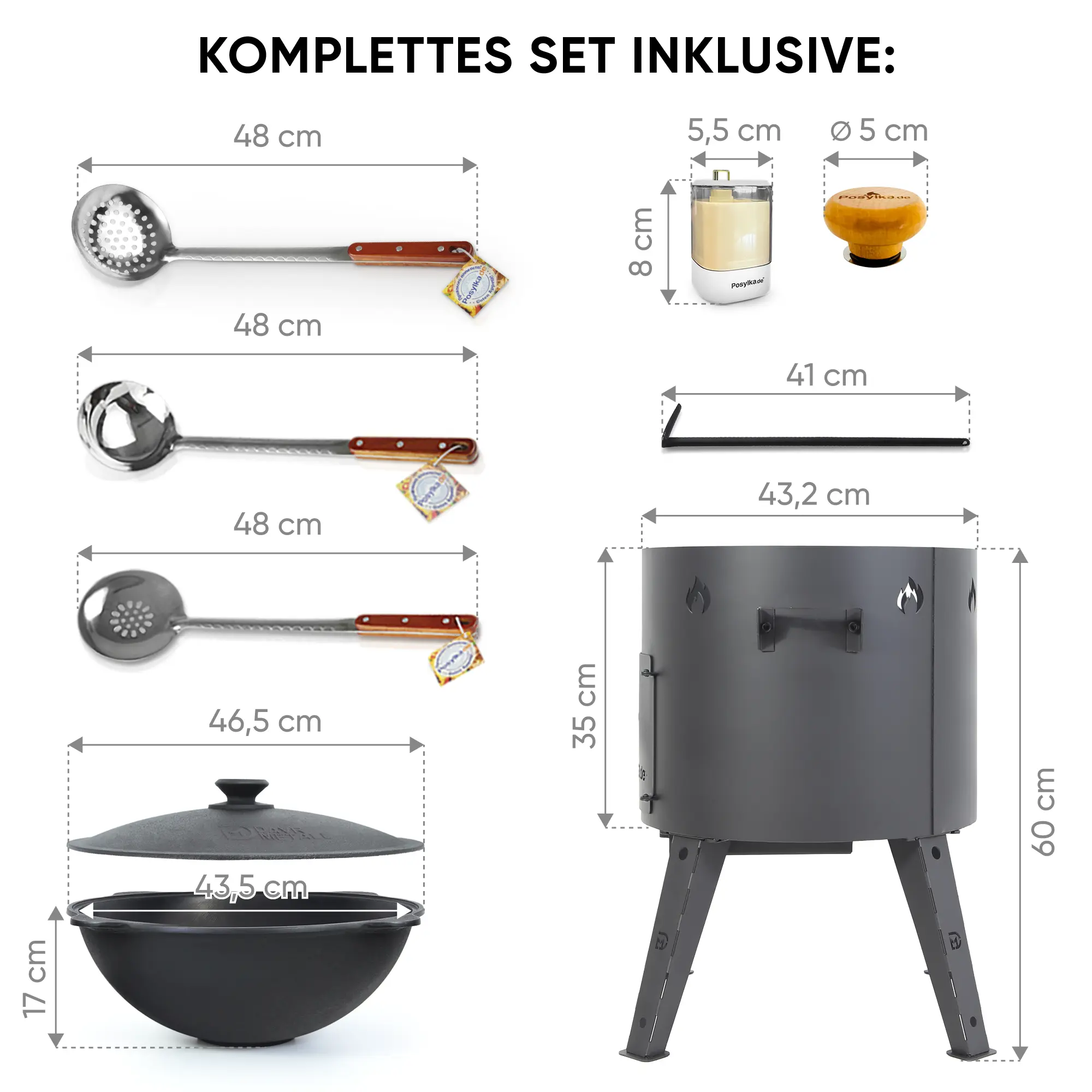 Deckel: 1 Stk., Kugelschreiber: 1 Stk., Feuerhaken 41 cm, Automatischer Zahnstocherspender, Utschak Ø 44 cm, Kasan 16 L, Ø 46,5 cm, Schaumlöffel für Plov, tief, 48 cm, Schaumlöffel für Plov, 48 cm, Schöpfkelle für Plov, 48 cm