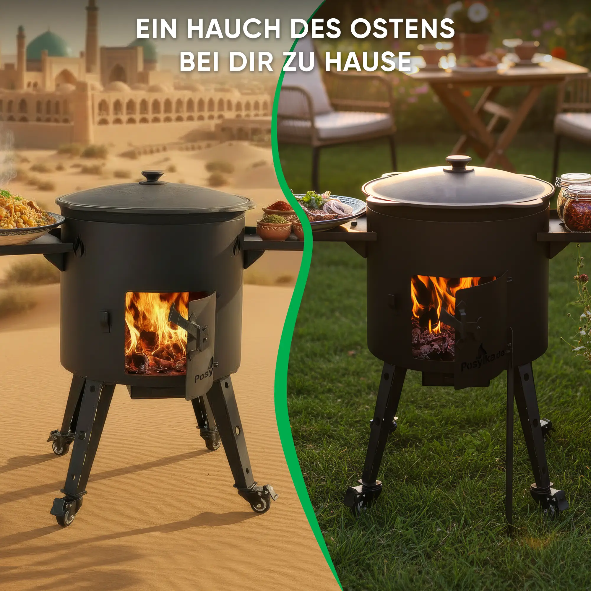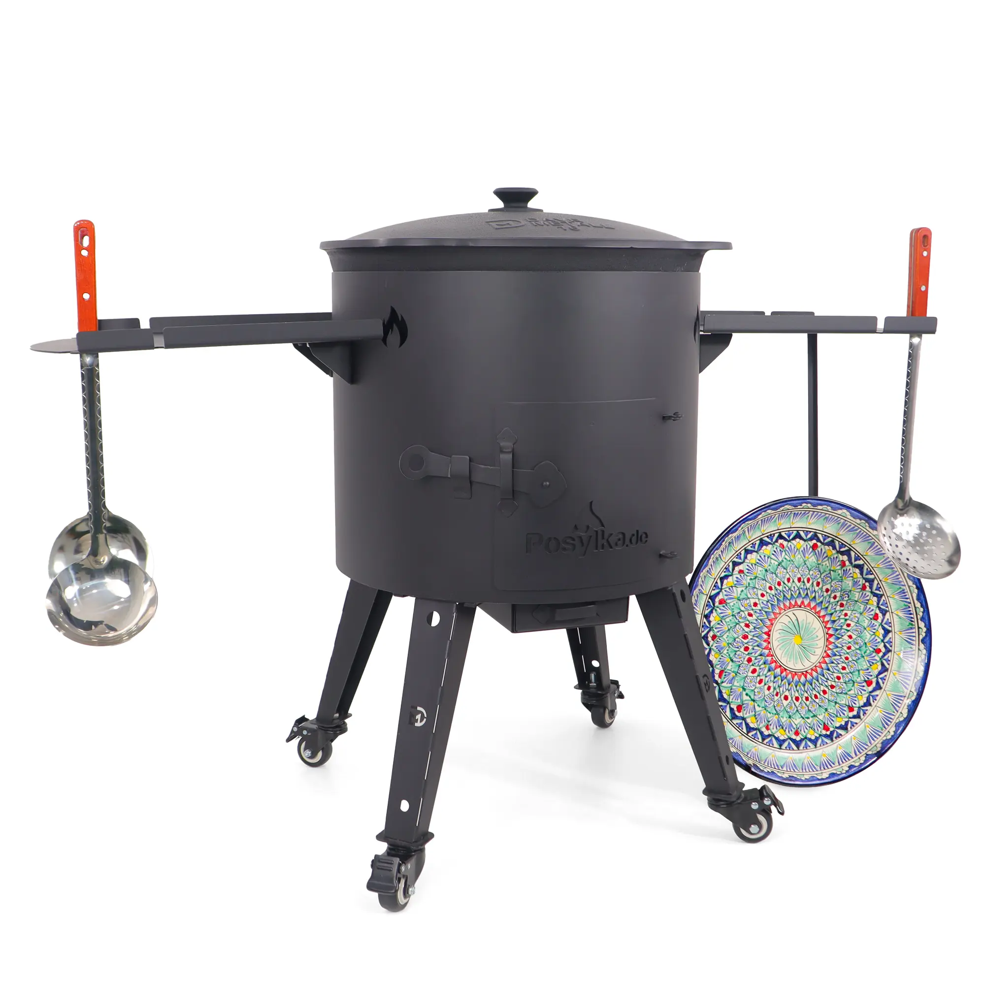 Utschak Feuerofen Ø 44 cm + Gusseisen-Kasan 16 l, flacher Boden, Transportrollen, Ablagetische + Küchenzubehör, Usbekischer Kochtopf aus Gusseisen