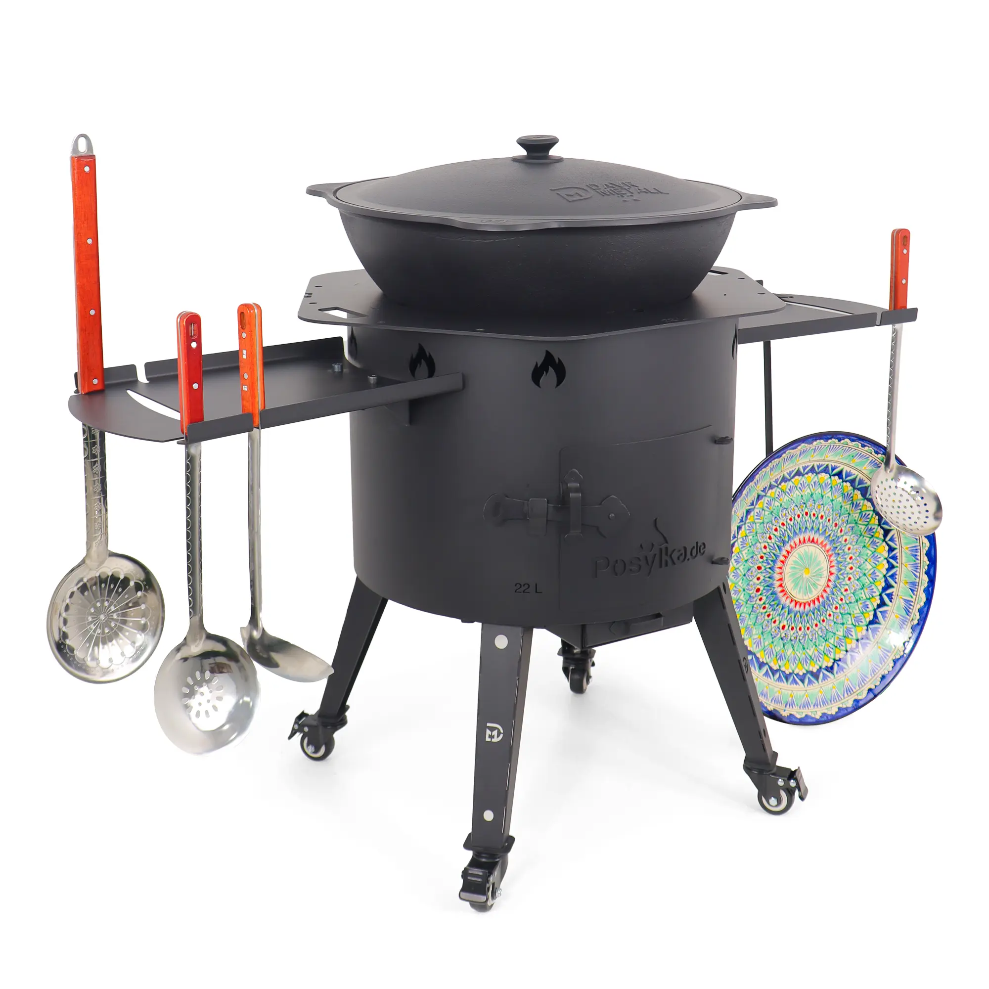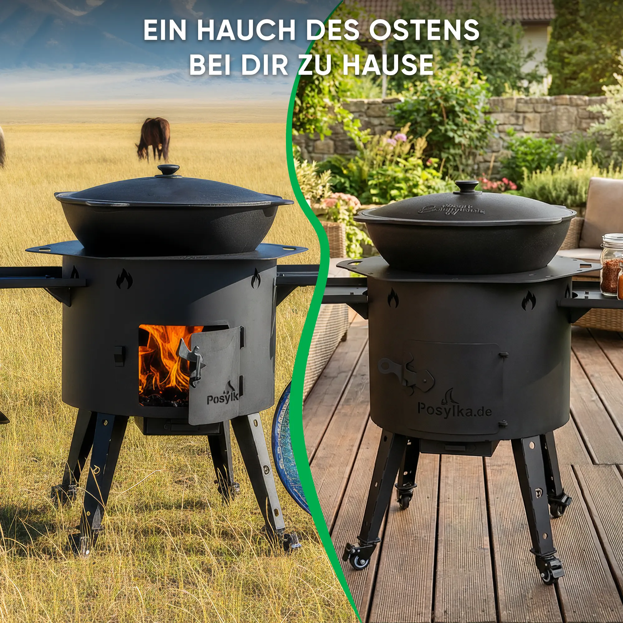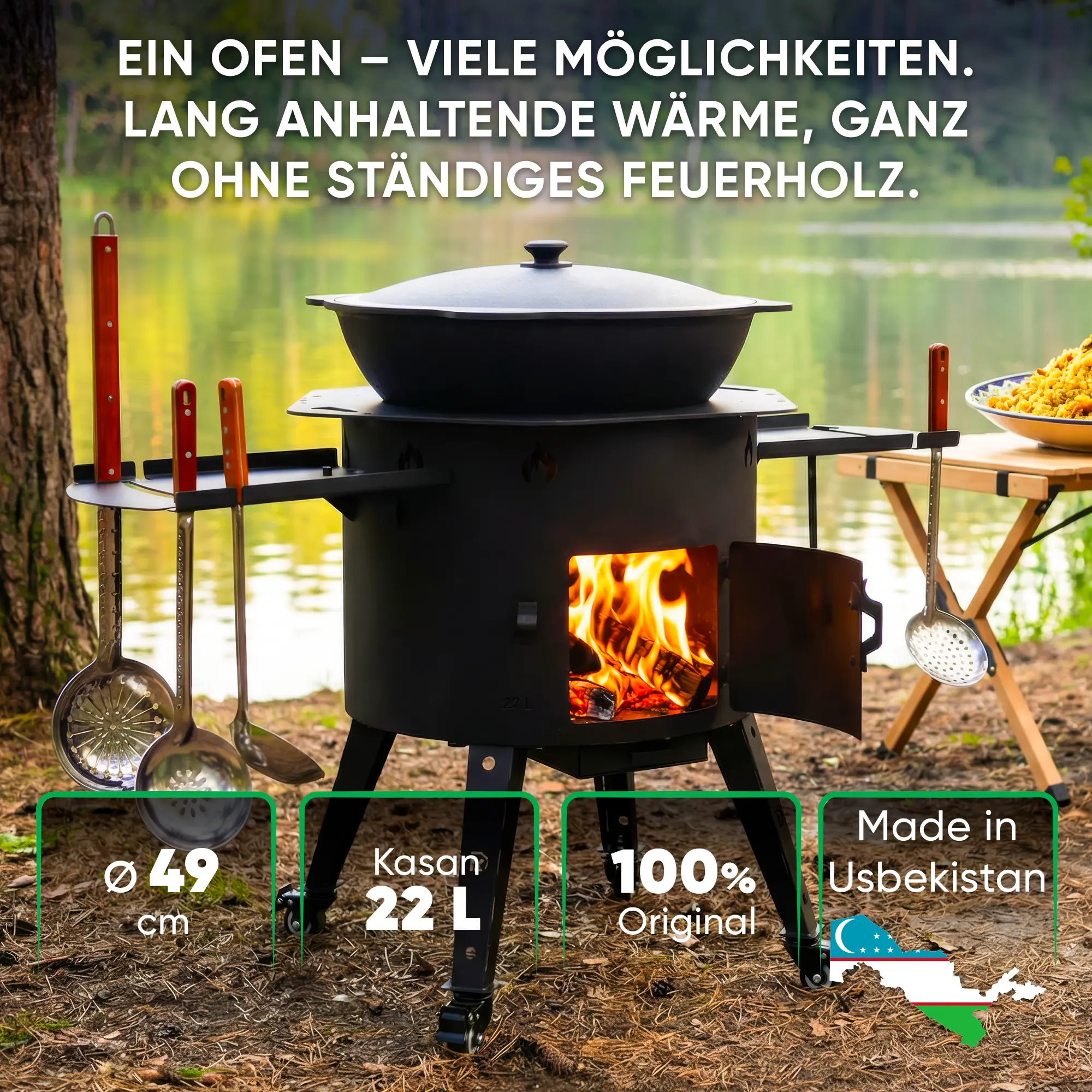 Utschak Feuerofen Ø 49 cm + Gusseisen-Kasan 22 L, flacher Boden, Transportrollen, Ablagetische, Ofenplatte + Küchenzubehör, Usbekischer Kochtopf aus G