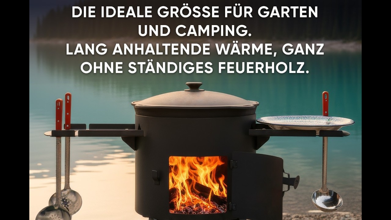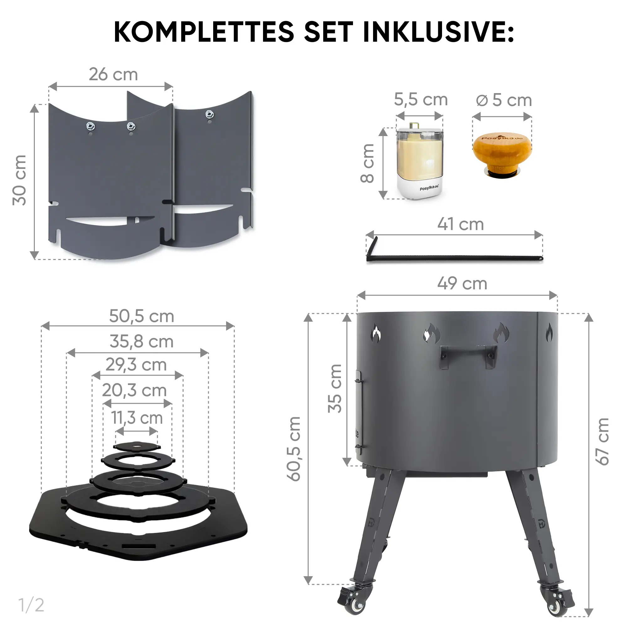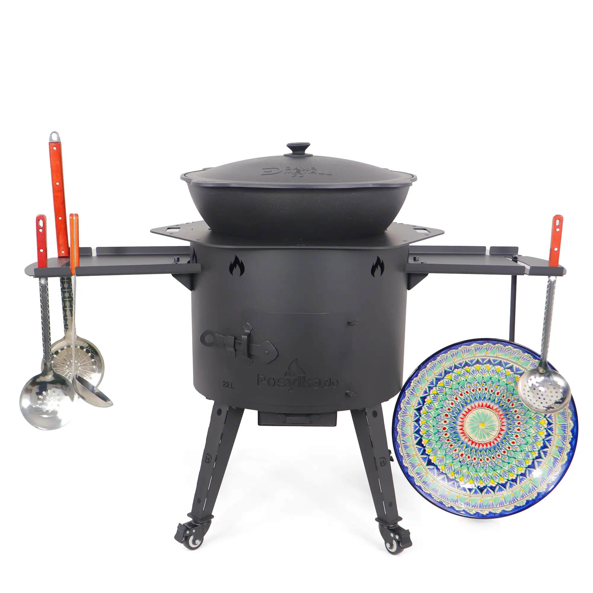 Utschak Feuerofen Ø 49 cm + Gusseisen-Kasan 22 L, flacher Boden, Transportrollen, Ablagetische, Ofenplatte + Küchenzubehör, Usbekischer Kochtopf aus G