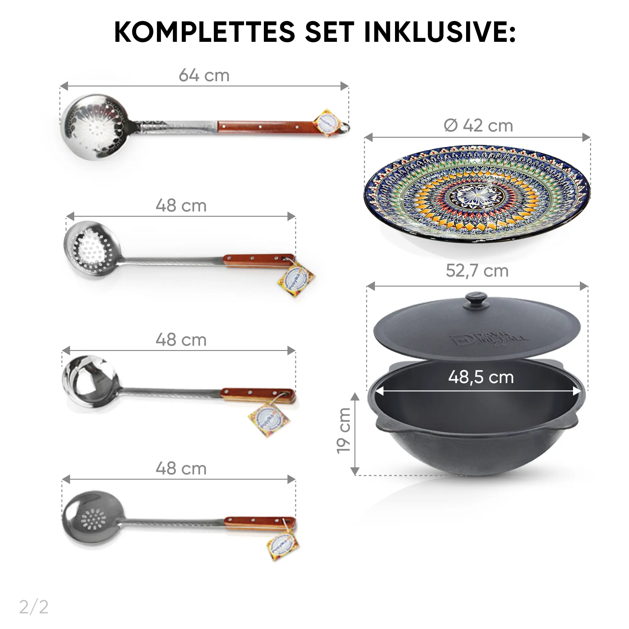 Utschak Feuerofen Ø 49 cm + Gusseisen-Kasan 22 L, runder Boden + Küchenzubehör, Usbekischer Kochtopf aus Gusseisen