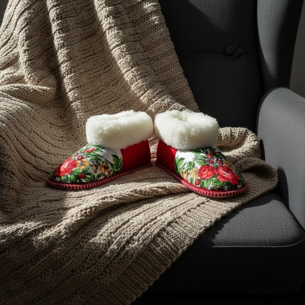 Тапочки чуни из овечьей шерсти и с оригинальным павловопосадским принтом - это обувь ручной работы. Красивые, теплые, натуральные чуни для дома, подарят вам хорошее настроение, полный комфорт для ног, так как в такой обуви всегда поддерживается оптимальная температура и ноги в такой обуви не потеют.