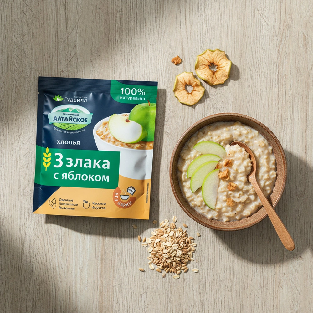 Овсяные хлопья, Пшеничные хлопья, Ячменные хлопья, Яблоко сушеное, Сахар, Соль