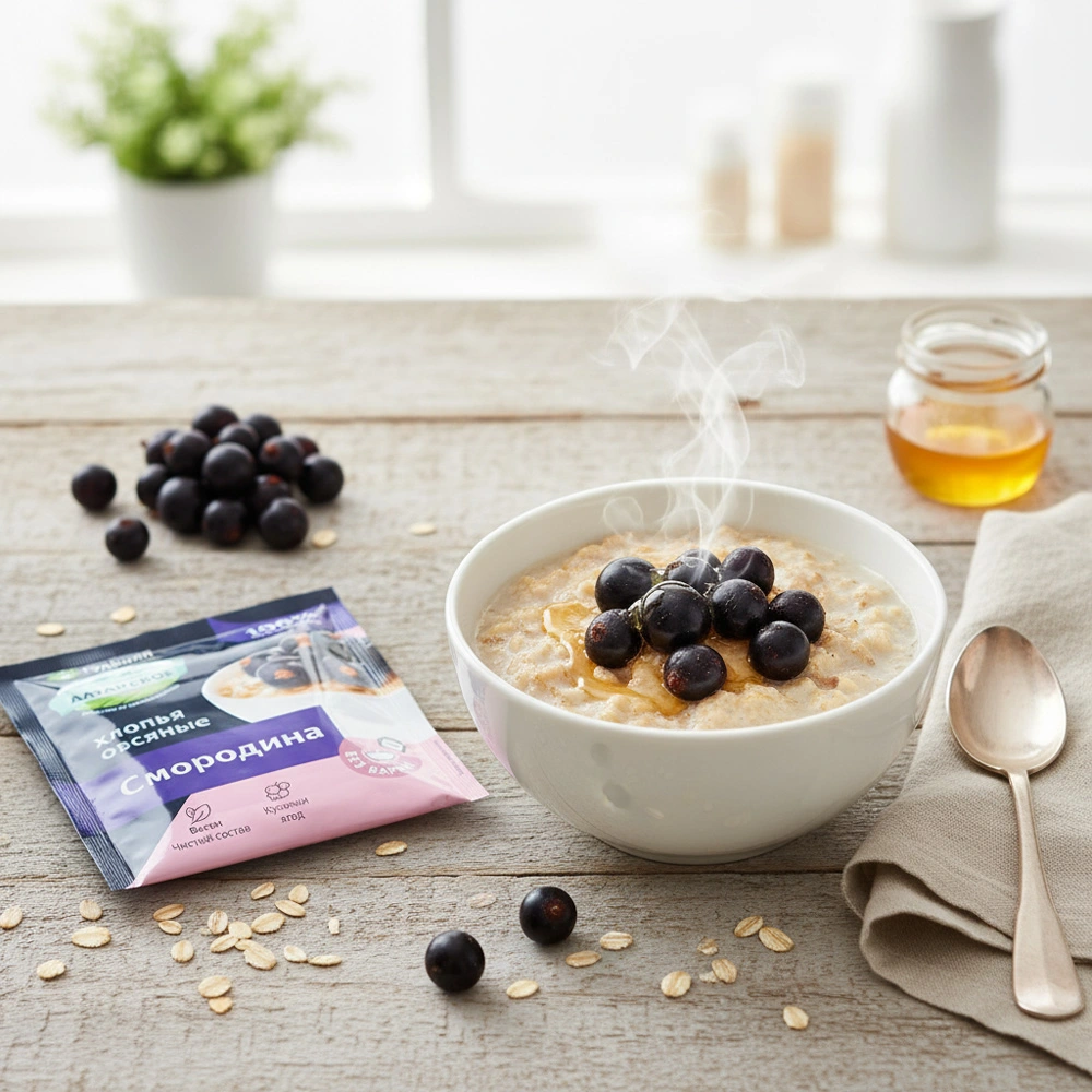 Овсяные хлопья, Ягоды смородины, Сахар, Соль