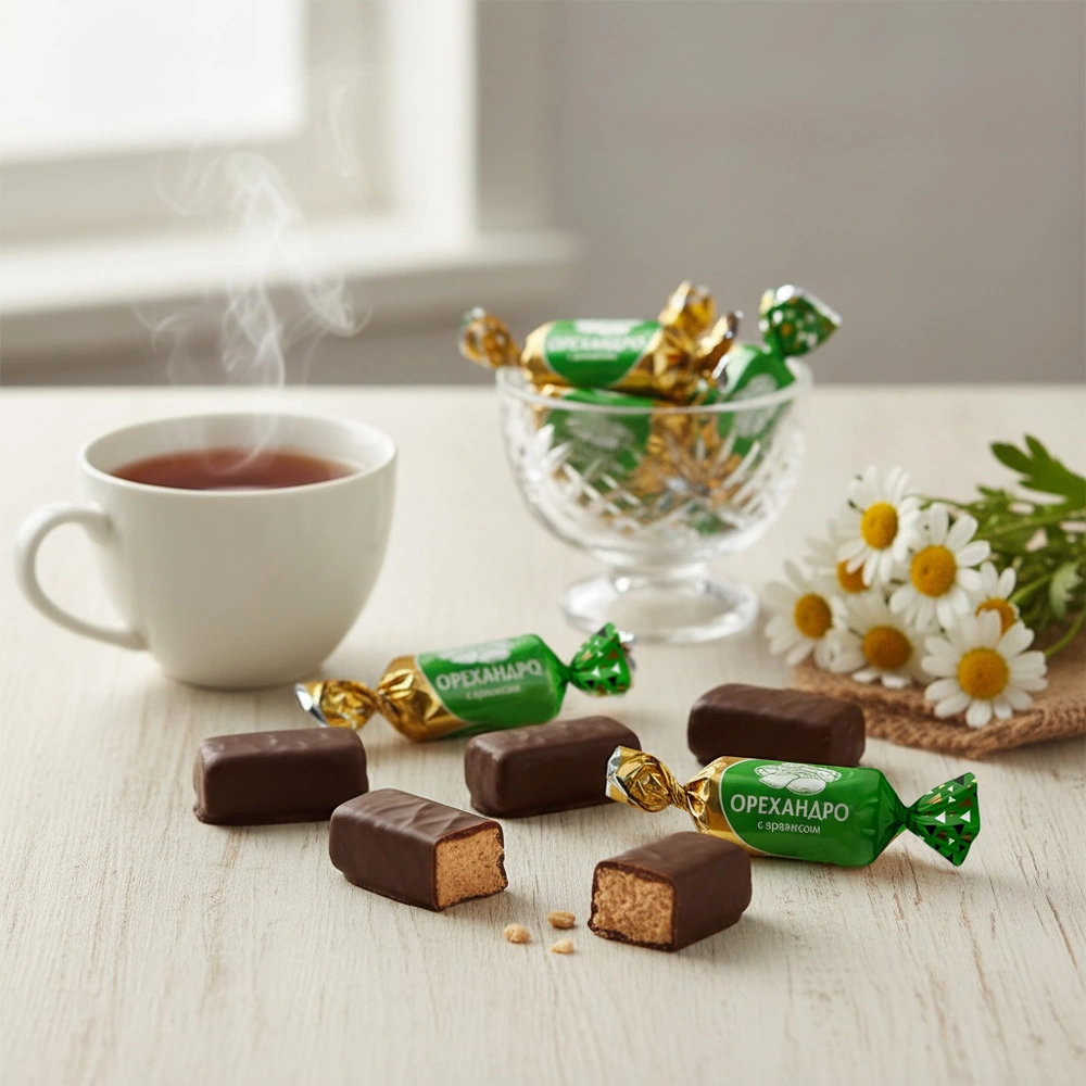 Состав: Глюкозная патока, Ароматизатор, Обезжиренный порошок какао, Консервант диоксид серы, Какаосодержащая глазурь 22 % (сахар, какао тертое, жир растительный (пальмовое, ши), обезжиренный порошок какао, эмульгаторы: соевый лецитин, Е 476; ароматизатор), Сгущенное молоко 15 % (молоко, сахар), Мякоть апельсина, Растительные жиры и масла (пальмовое, подсолнечное, пальмоядровое) частично гидролизированное, E306