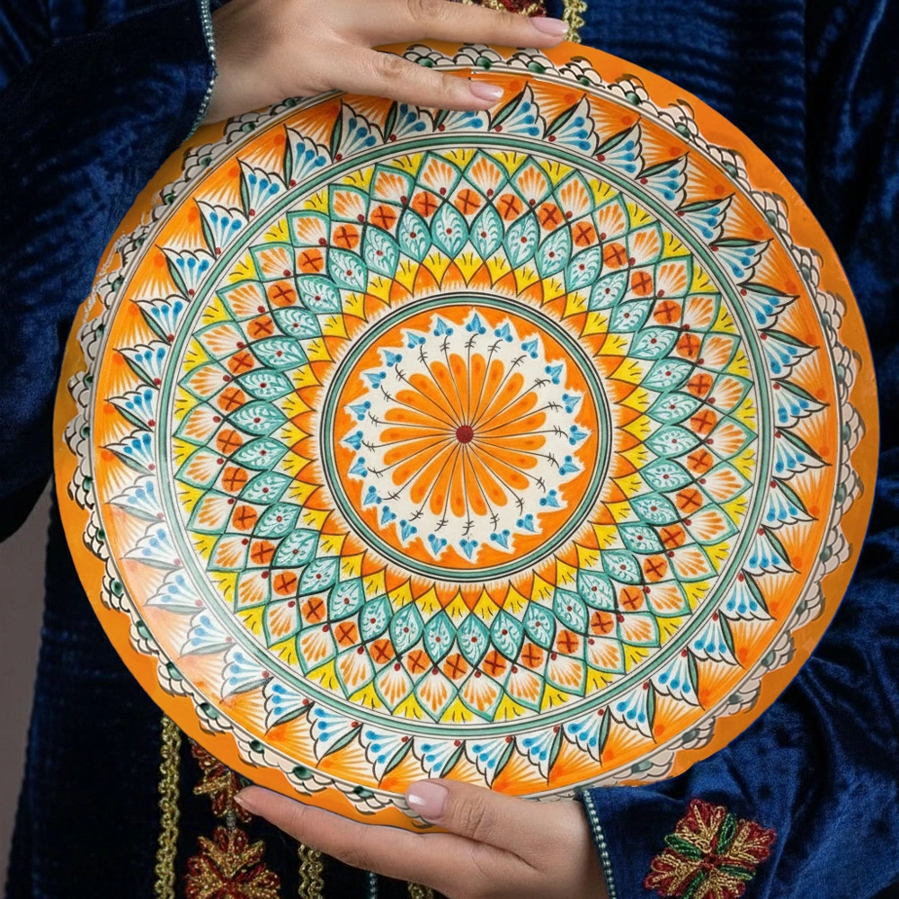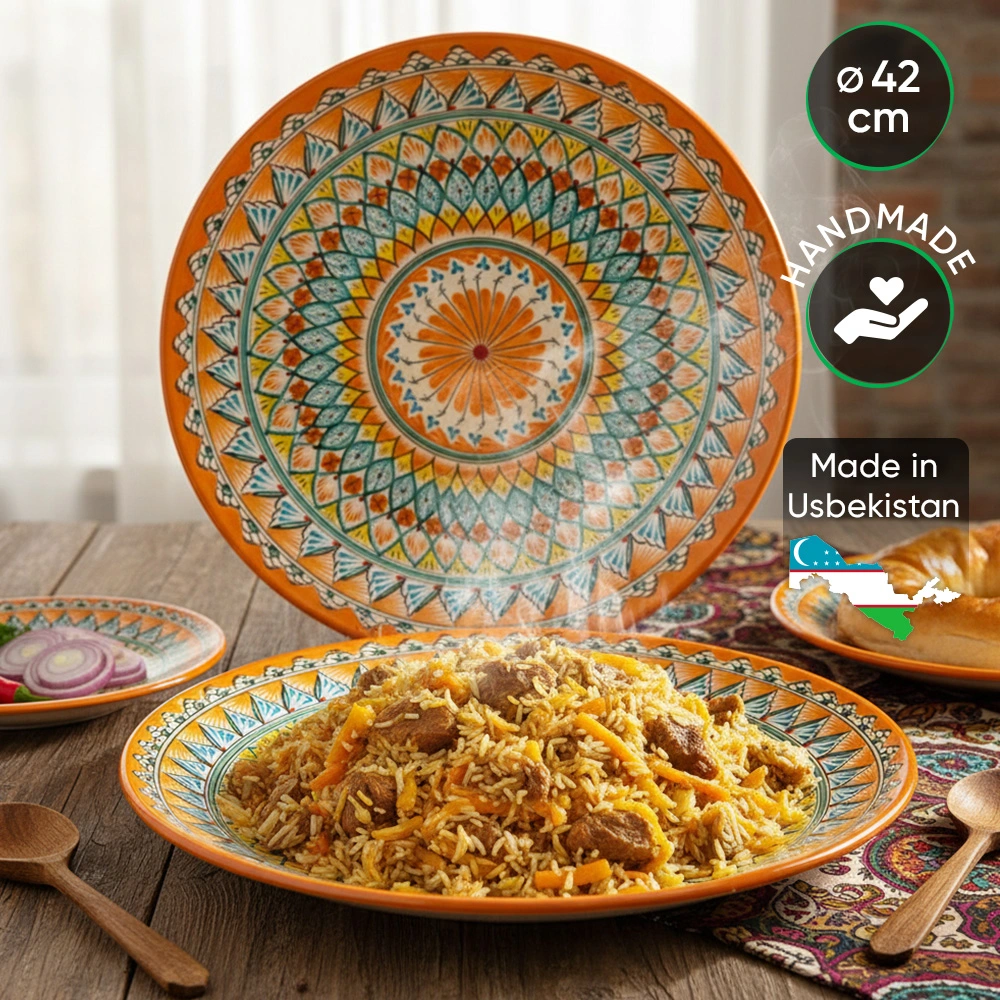 Ляган оранжевый Мехроб, Риштан керамика, ручная работа, узор МИКС Ø 42 см