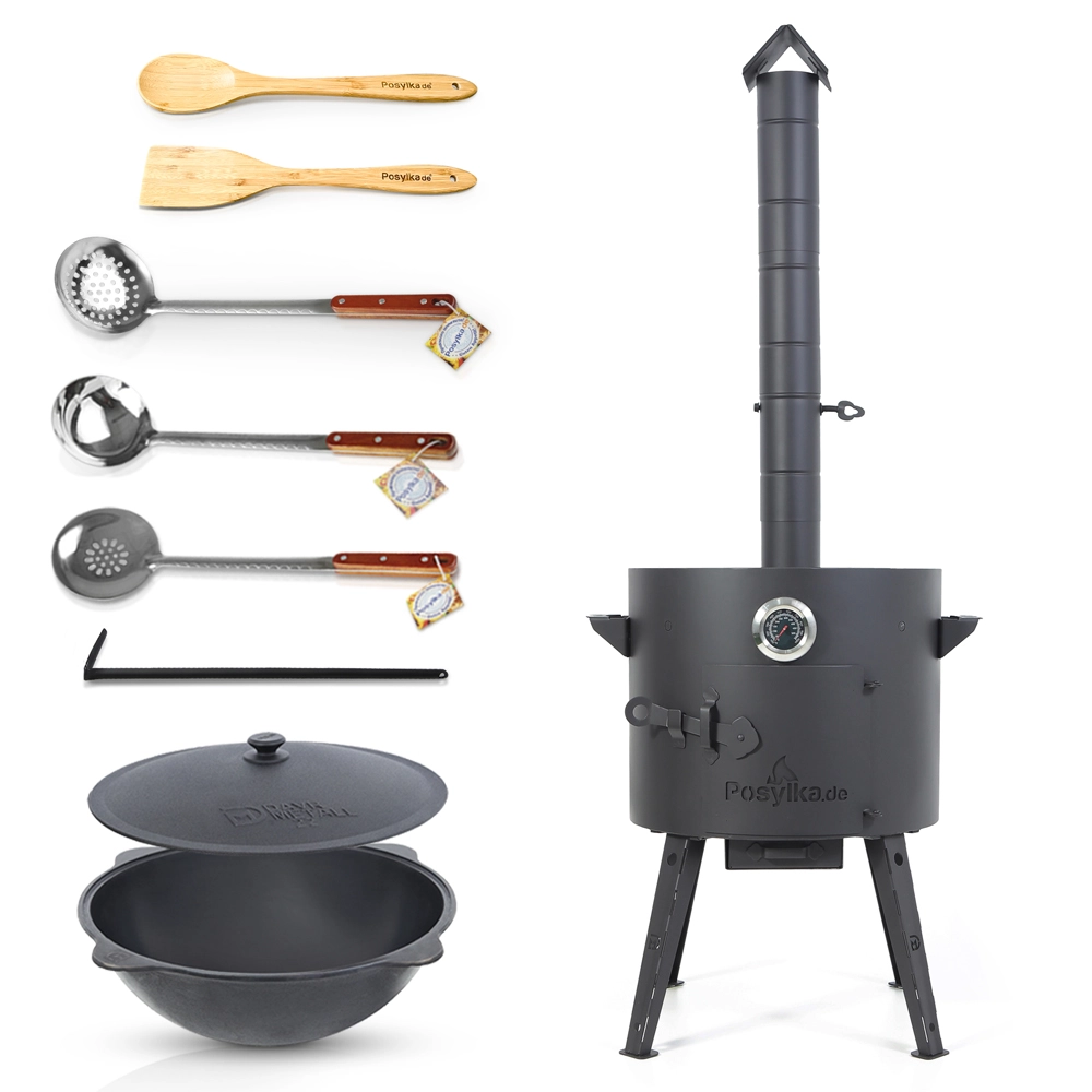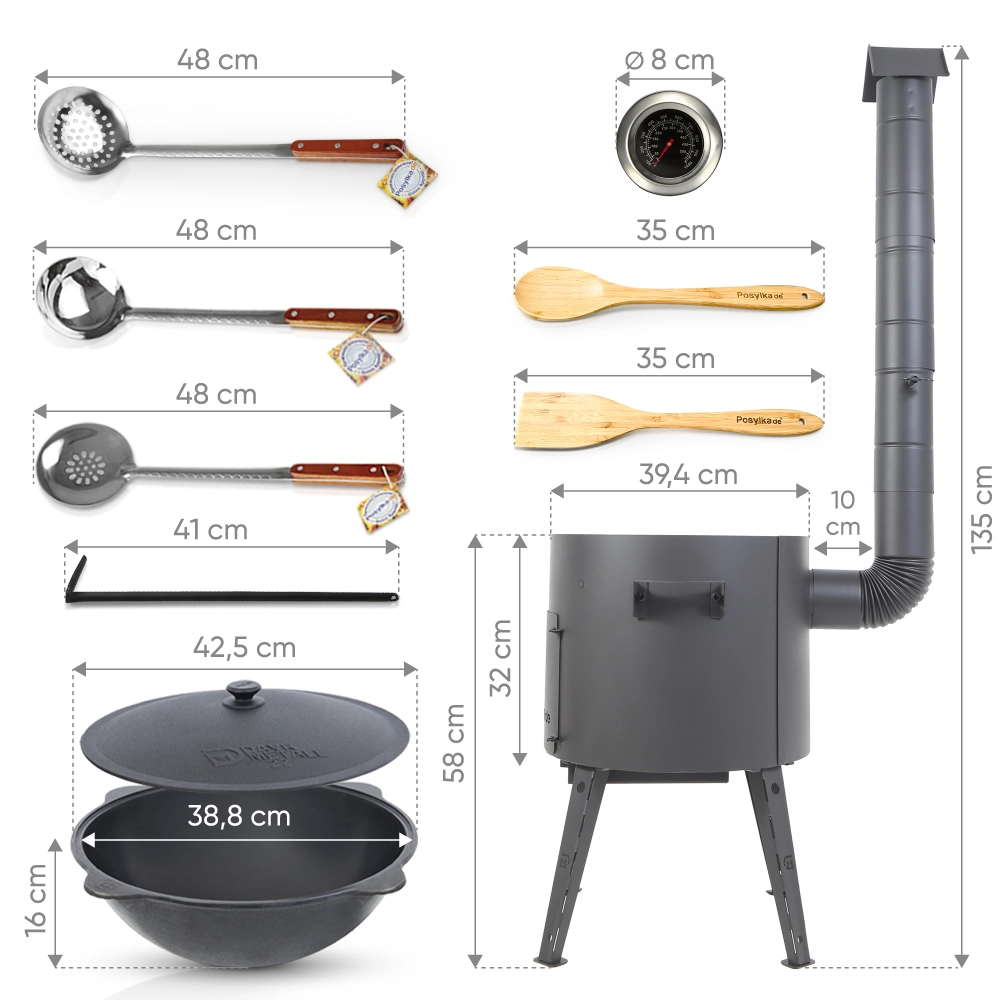 Набор - Печь - КазаноFF, 12 литров, Ø 40 см + термометр + казан чугунный, круглое дно, Ø 42,5 см, 12 л + шумовка : 2 шт. + поварёшка + лопатка, ложка