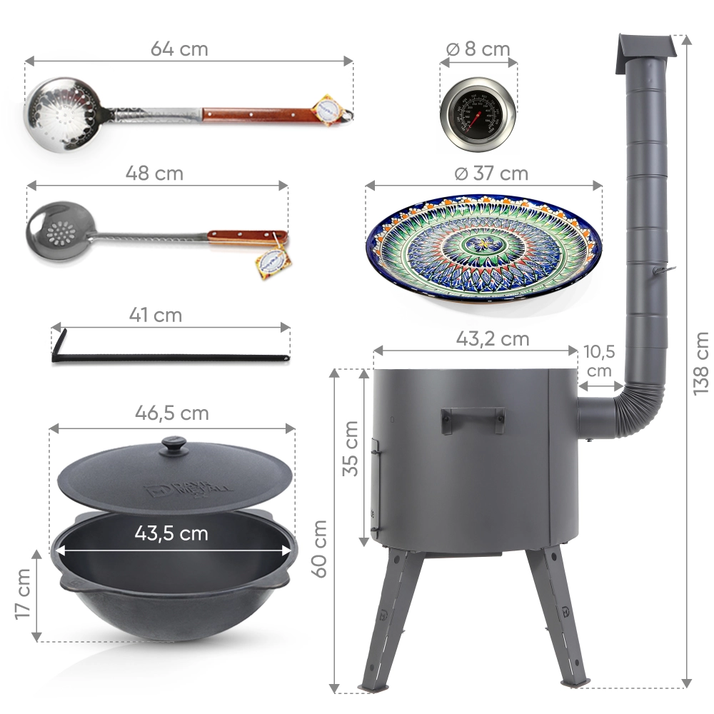 Кочерга 41 см, Крышка, Термометр, Шумовка узбекская для плова, 64 см, Печь Ø 44 см, Шумовка узбекская для плова, 48 см, Ляган Ø 37 см: 1 шт., Казан 16 л, Ø 46,5 см