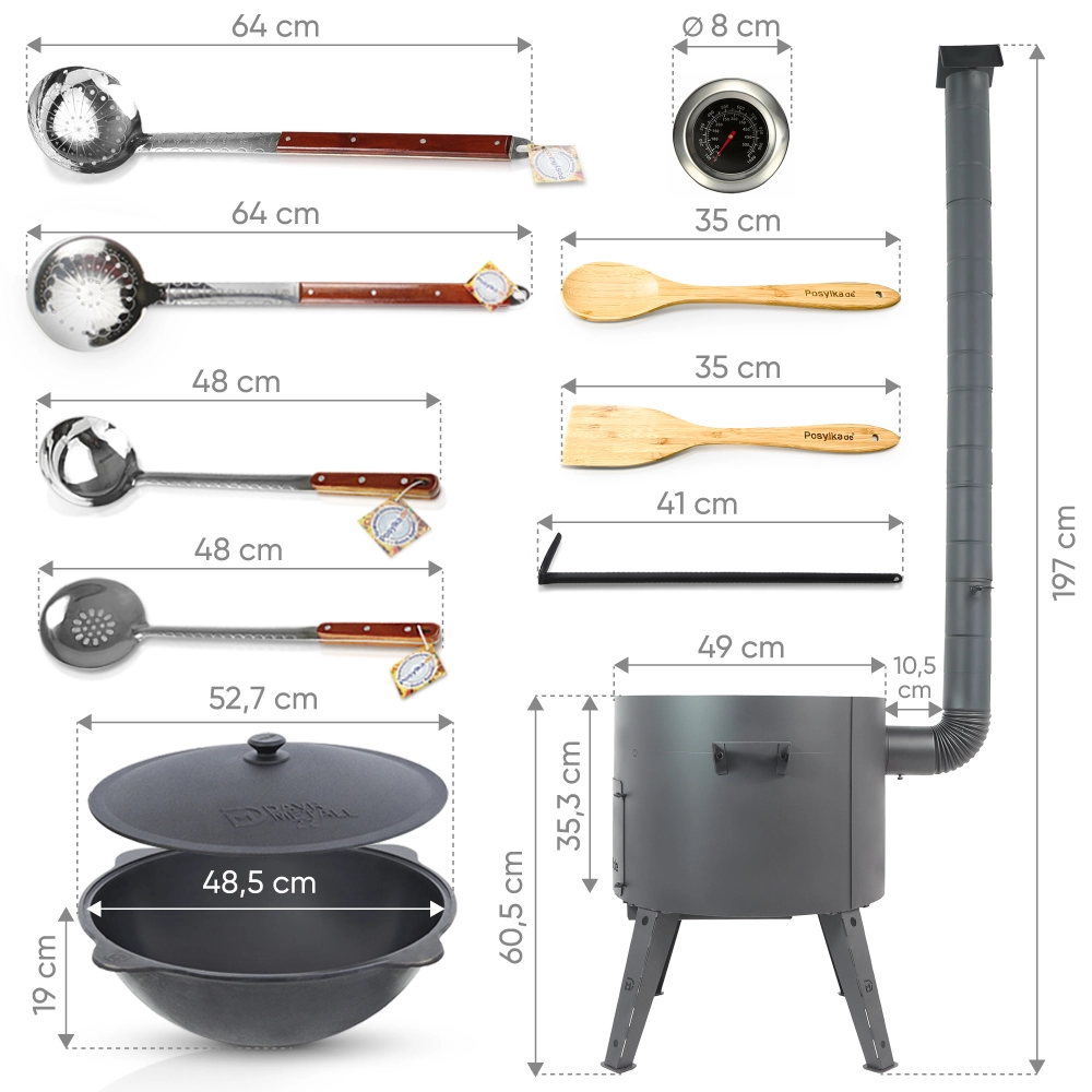 Трубка-удлинитель, Кочерга 41 см, Крышка, Деревянная ложка: 1 шт., Лопатка деревянная, Термометр, Шумовка узбекская для плова, 64 см, Шумовка узбекская для плова, 48 см, Шумовка узбекская для плова, глубокая, 64 см, Печь Ø 49 см, Поварёшка узбекская для плова, 48 см, Казан 22 л, Ø 52,7 см