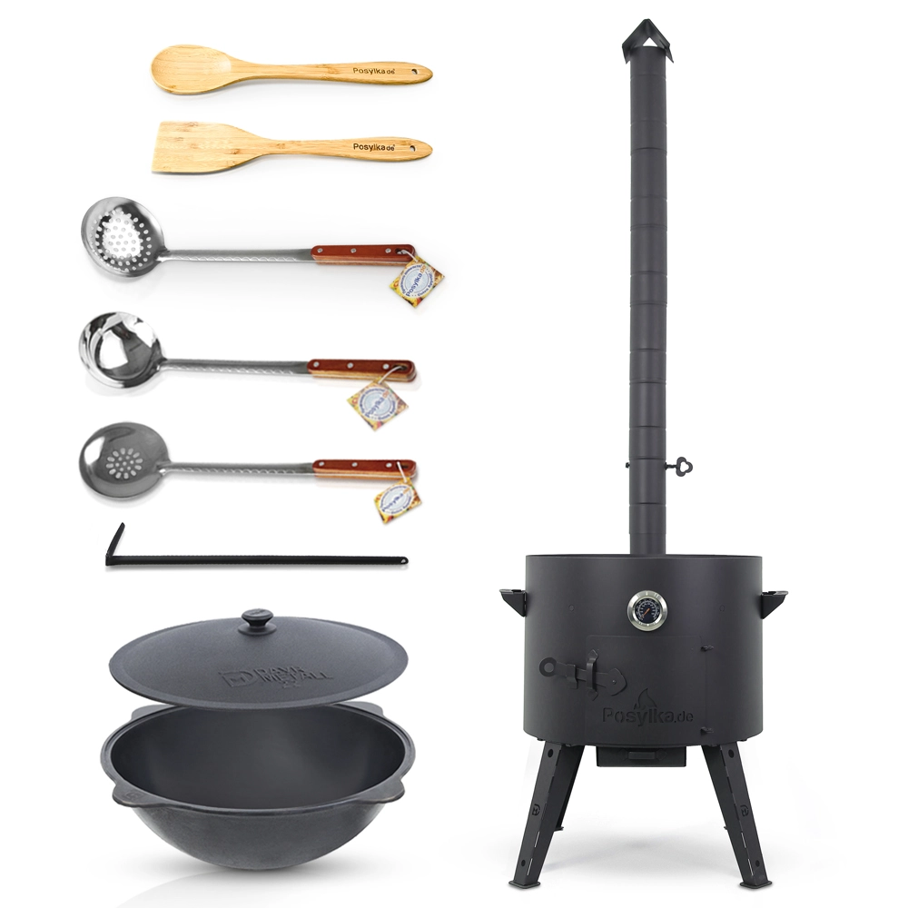 Набор - Печь - КазаноFF, 22 литра, Ø 49 см + термометр + удлинитель трубы + казан чугунный, круглое дно, 22 л, Ø 52,7 см + шумовка: 3 шт. + поварёшка