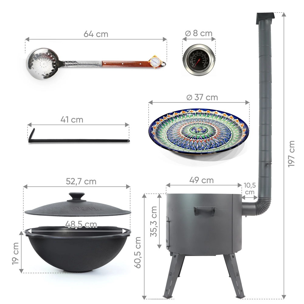 Трубка-удлинитель, Кочерга 41 см, Крышка, Термометр, Шумовка узбекская для плова, 64 см, Печь Ø 49 см, Ляган Ø 42 см: 1 шт., Казан 22 л, Ø 52,7 см
