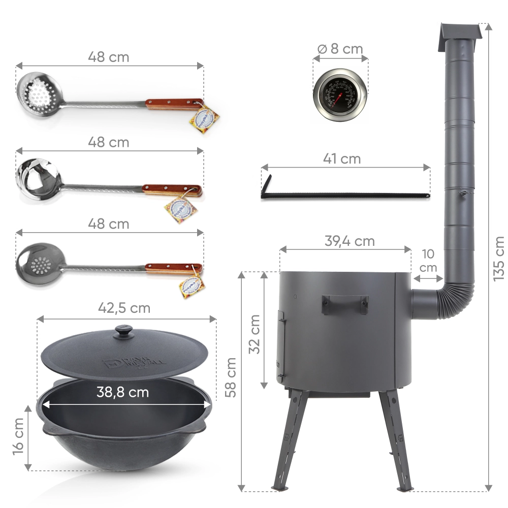 Набор - Печь - КазаноFF, для казана 12 литров, Ø 40 см + термометр + казан чугунный, круглое дно, Ø 42,5 см, 12 л + шумовка: 2 шт. + поварёшка