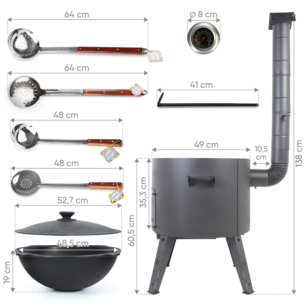 Кочерга 41 см, Крышка, Термометр, Шумовка узбекская для плова, 64 см, Шумовка узбекская для плова, 48 см, Шумовка узбекская для плова, глубокая, 64 см, Печь Ø 49 см, Поварёшка узбекская для плова, 48 см, Казан 22 л, Ø 52,7 см