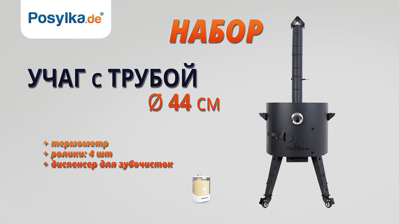 Набор: Печь учаг Ø 44 см с трубой и термометром, чугунный казан 16 л круглое дно, аксессуары