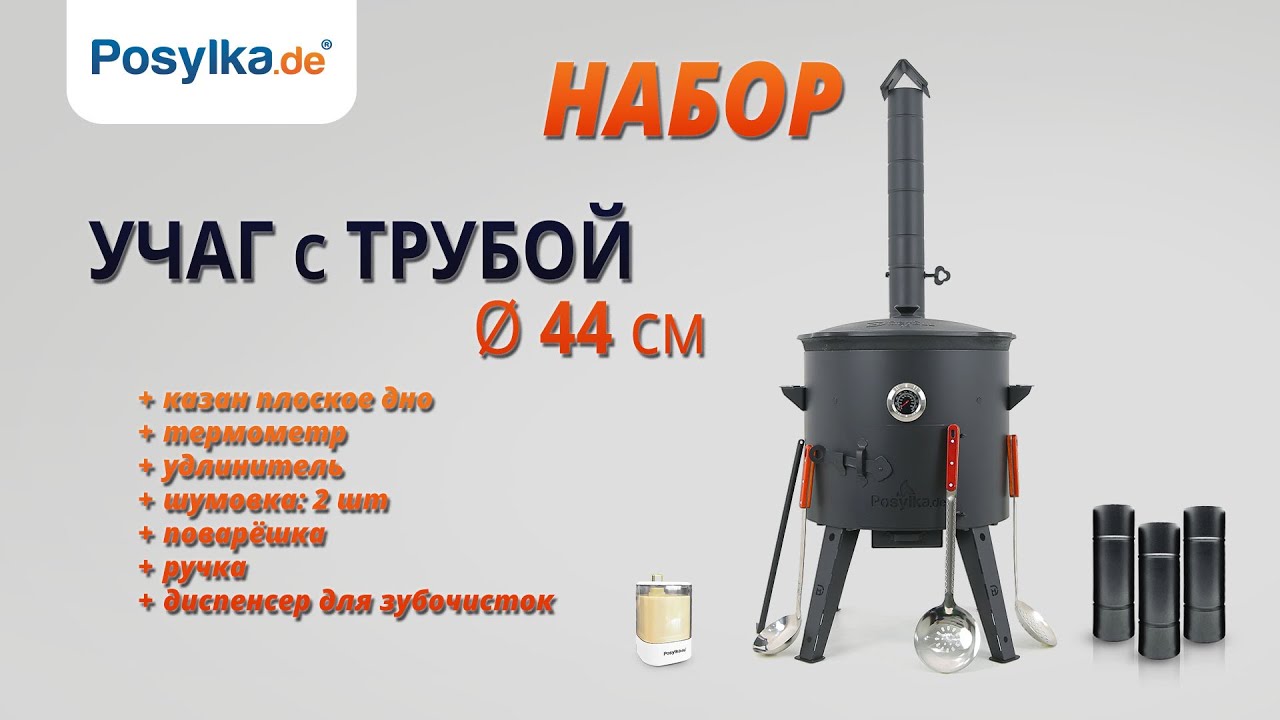 Набор: Печь учаг Ø 44 см с трубой и термометром, чугунный казан 16 л плоское дно, аксессуары