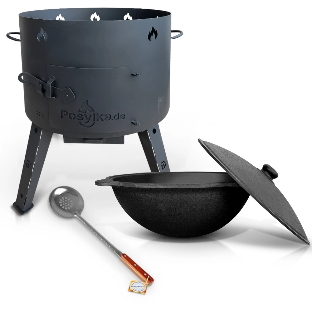 Набор - Учаг - КазаноFF, для казана 22 литра, Ø 49 см + Казан чугунный, алюминиевая крышка, круглое дно, 22 л, Ø 52,7 см + Шумовка узбекская для плова