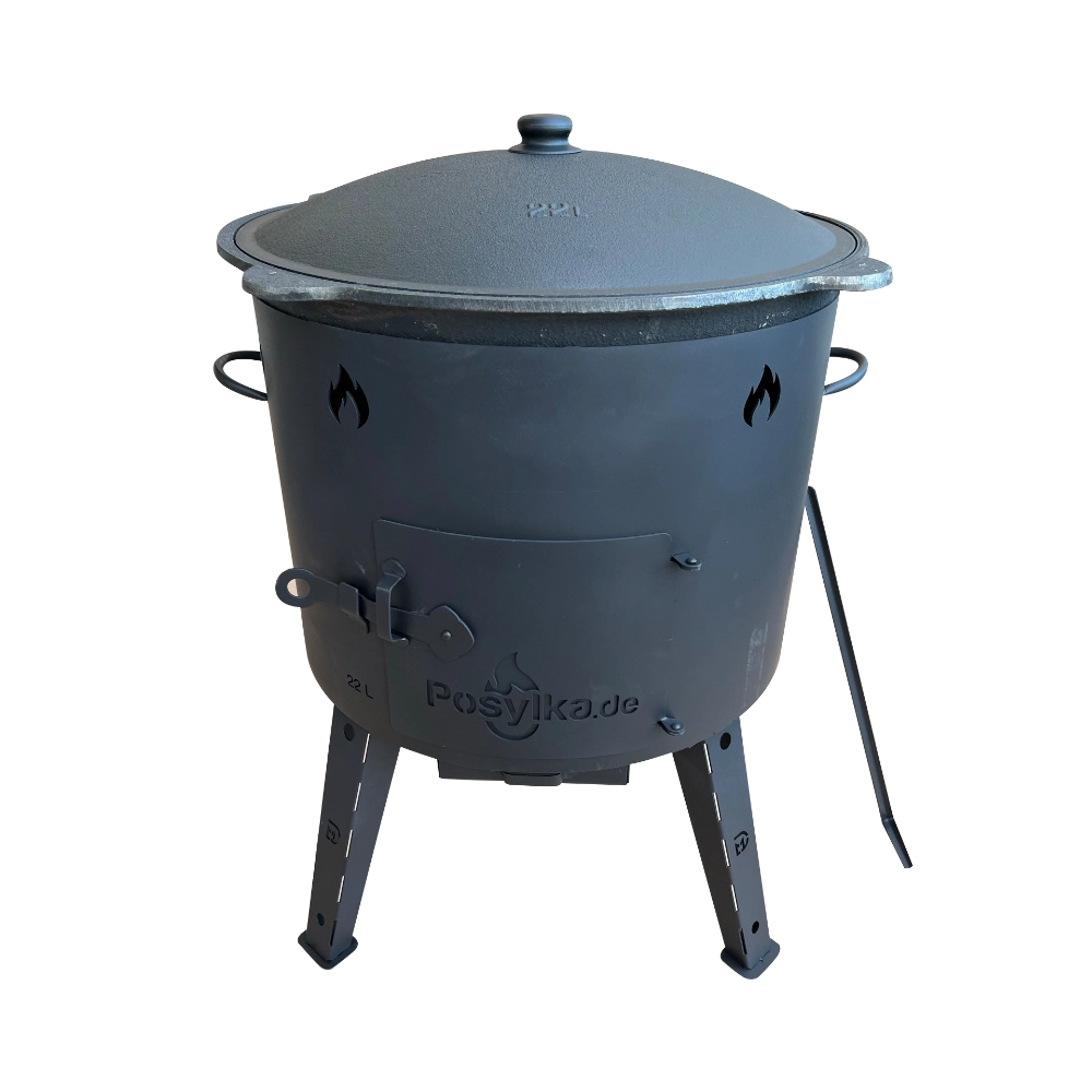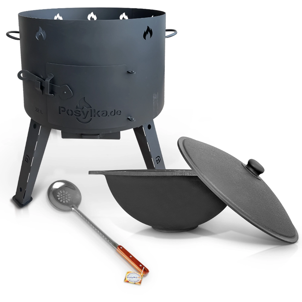 Набор - Учаг - КазаноFF, для казана 22 литра, Ø 49 см + Казан чугунный, алюминиевая крышка, плоское дно, 22 л, Ø 52,7 см + Шумовка узбекская для плова