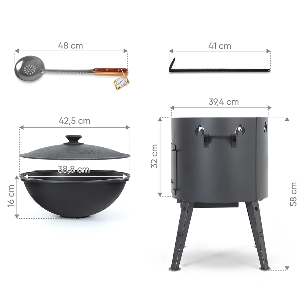 Набор - Учаг - КазаноFF, для Узбекского казана 12 литров, Ø 40 см + казан чугунный, алюминиевая крышка, плоское дно, Ø 42,5 см, 12 л + шумовка 48 см
