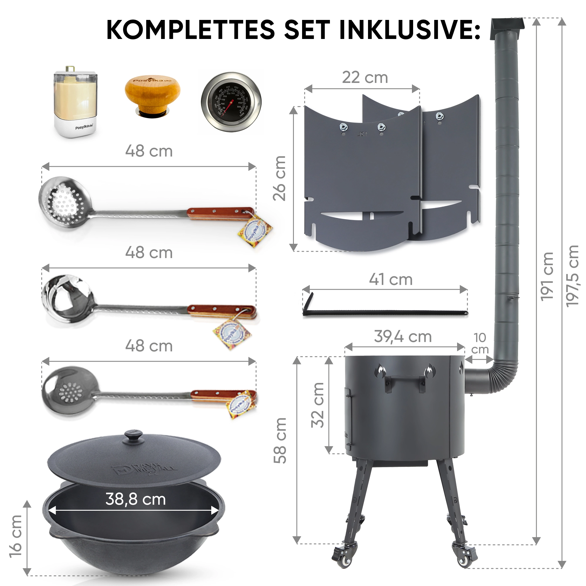 Набор - Учаг с трубой Ø 40 см + казан Ø 42,5 см,12 л + термометр + удлинитель + ролики: 4 шт. + столик: 2 шт. + шумовка + поварёшка + ручка