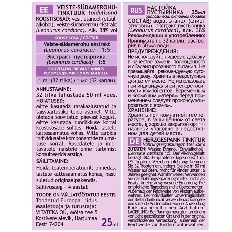 Состав: вода, этанол (спирт этиловый), экстракт пустырника (Leonurus cardiaca) 1:5. Содержание этанола – 38% об.
