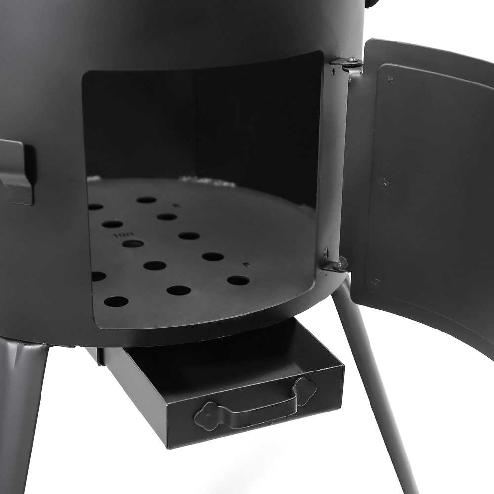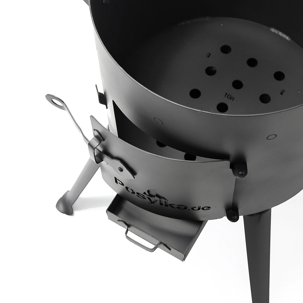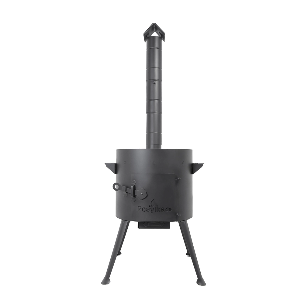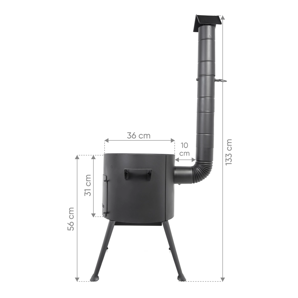Изделие представляет собой металлический цилиндр-корпус, в комплект которого входят съёмные ножки, дверце, кочерга и колосник. За счёт оптимальной толщины стенок (2 мм) исключена возможность деформации стенок изделия.