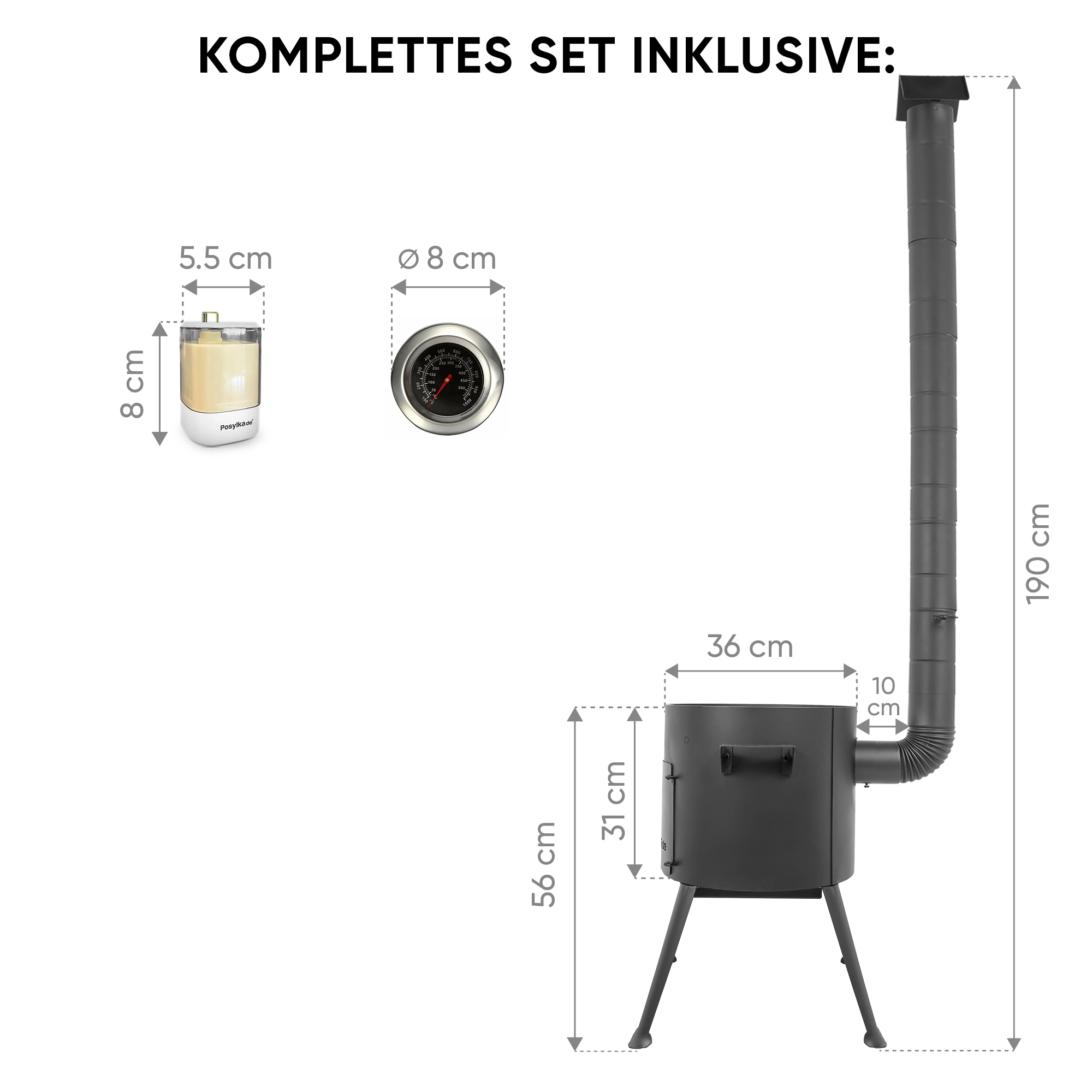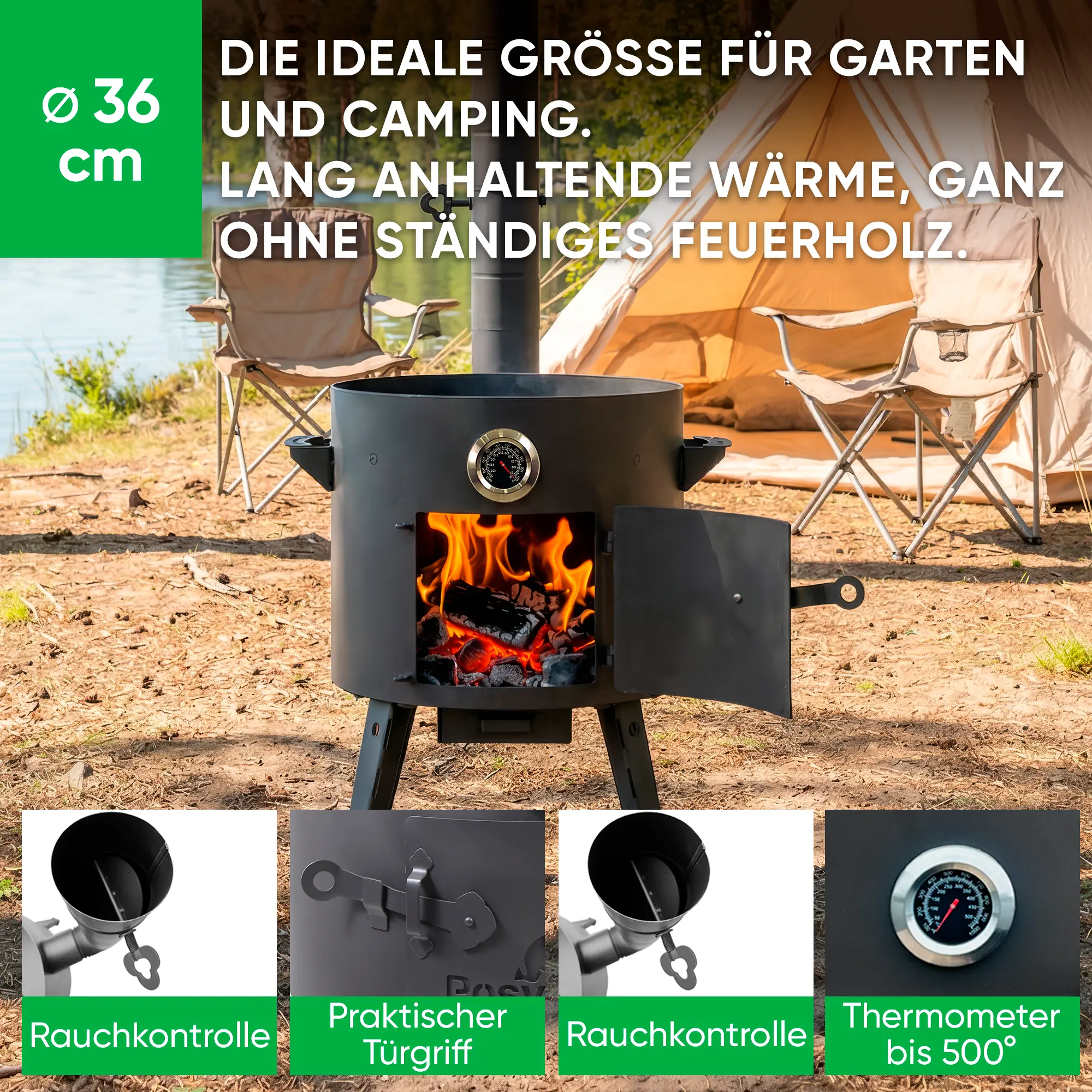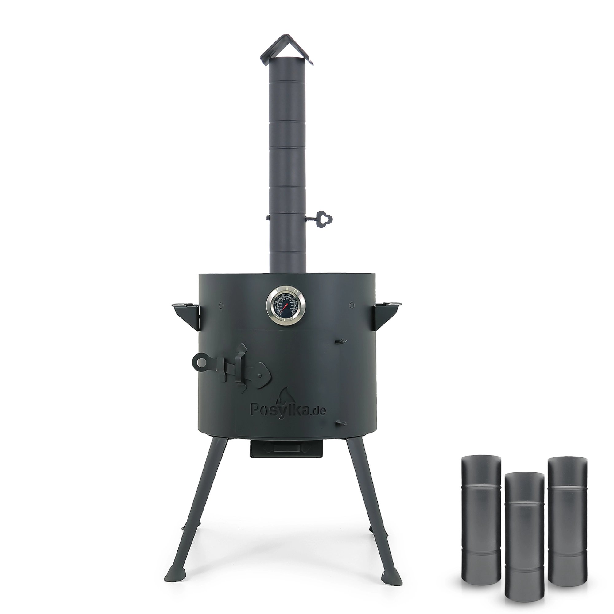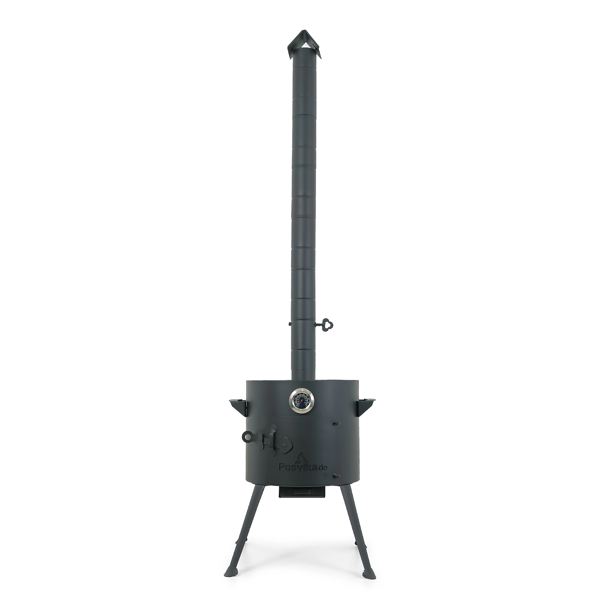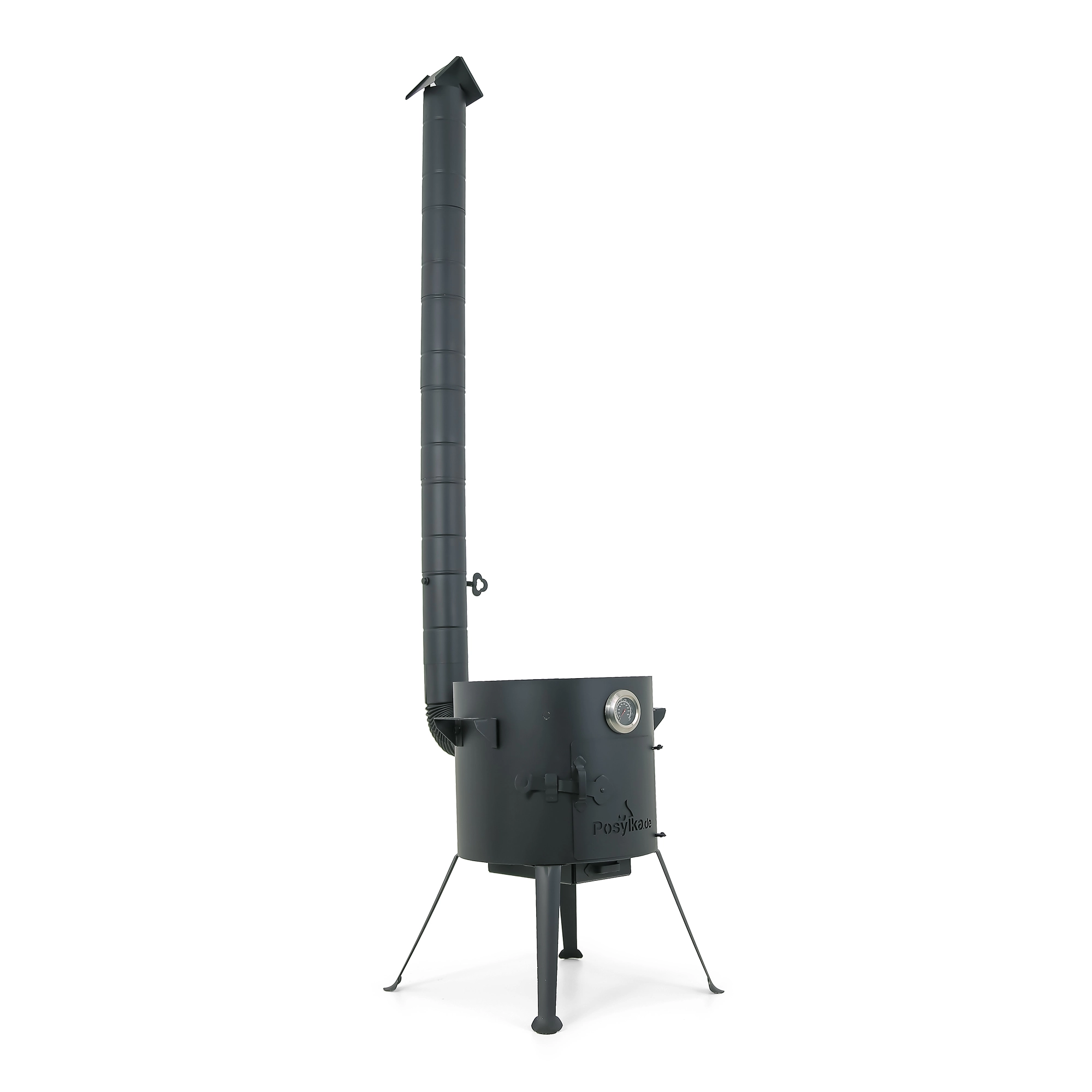 Изделие представляет собой металлический цилиндр-корпус, в комплект которого входят съёмные ножки, дверце, кочерга и колосник. За счёт оптимальной толщины стенок (2 мм) исключена возможность деформации стенок изделия.