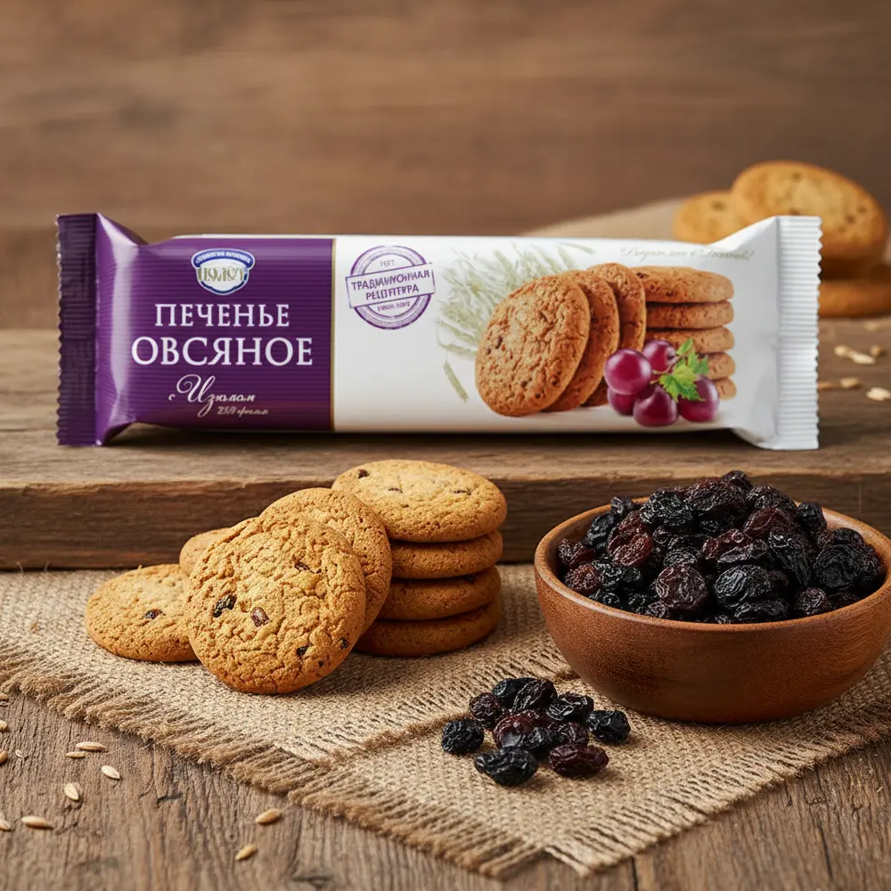 Пшеничная мука, Сахар, Изюм, Овсяная мука, Растительные масла (подсолнечное, пальмовое) частично отвержденное, Соль, Ароматизатор, Разрыхлитель гидрокарбонат натрия, Вода, Корица