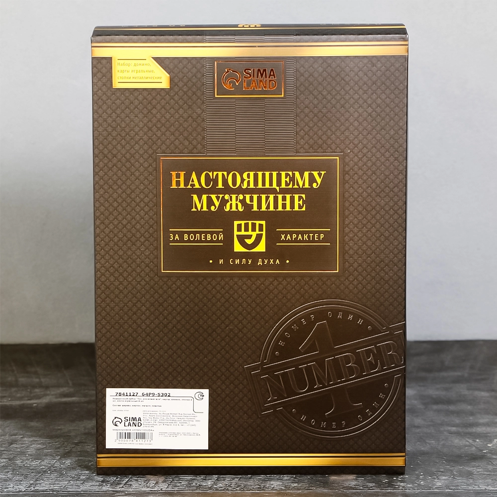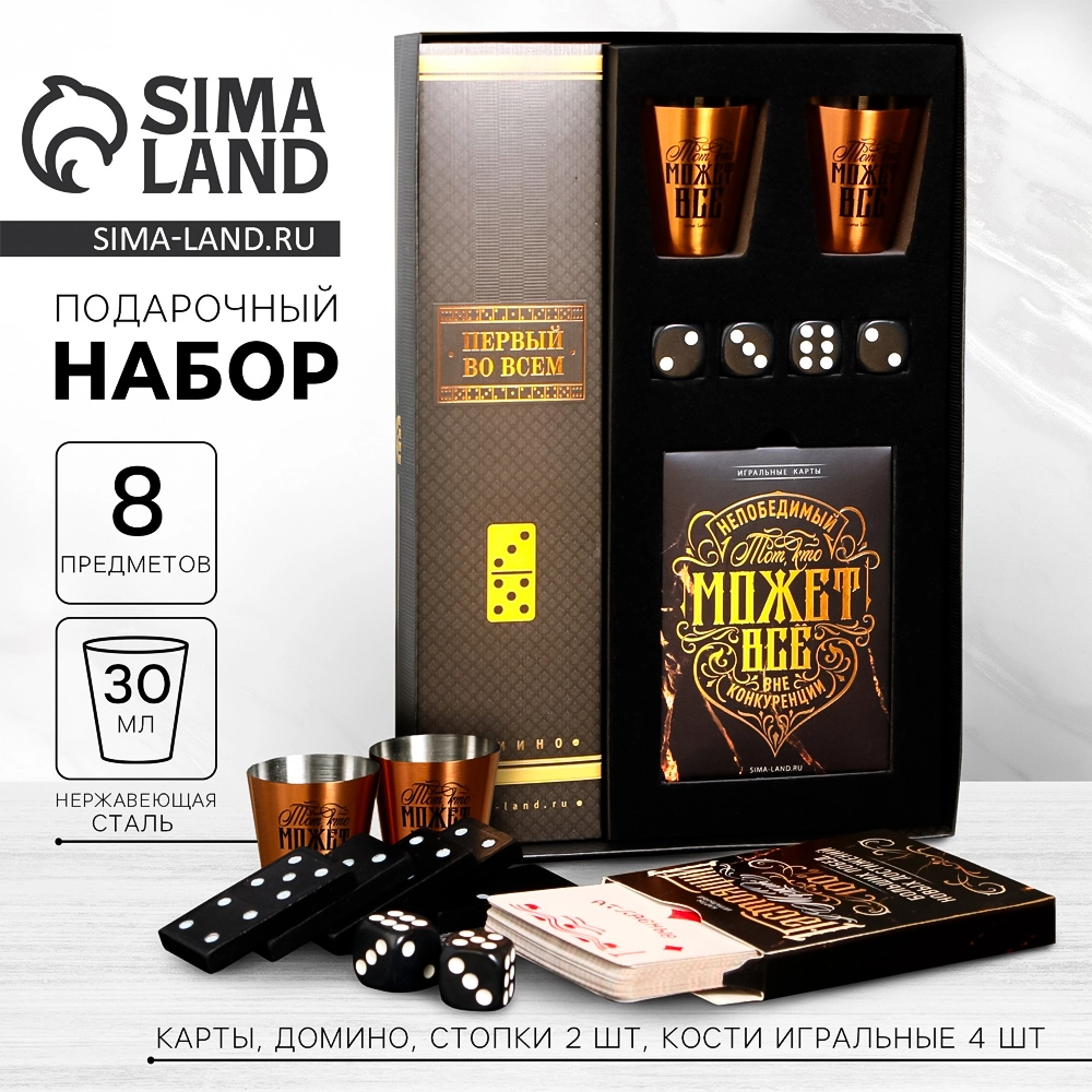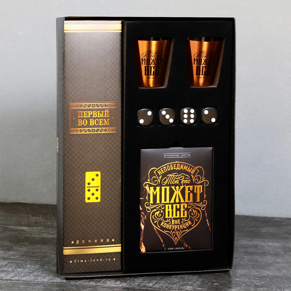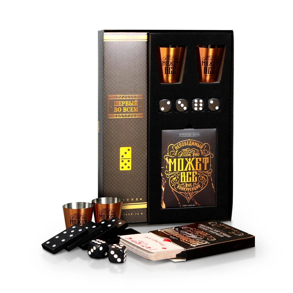 Подарочный набор - Тот, кто может все, карты 36 шт., домино, стопки 30 мл: 2 шт, кости игральные: 4 шт.