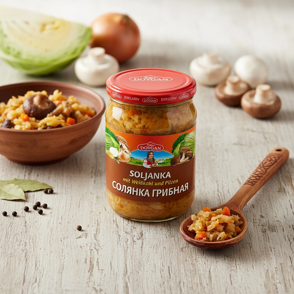 Солянка - крепкий и слегка кислый русский суп. Наша солянка "DOVGAN" традиционно состоит из белокочанной капусты, соленых грибов шиитаке, маринованных огурцов и лука.