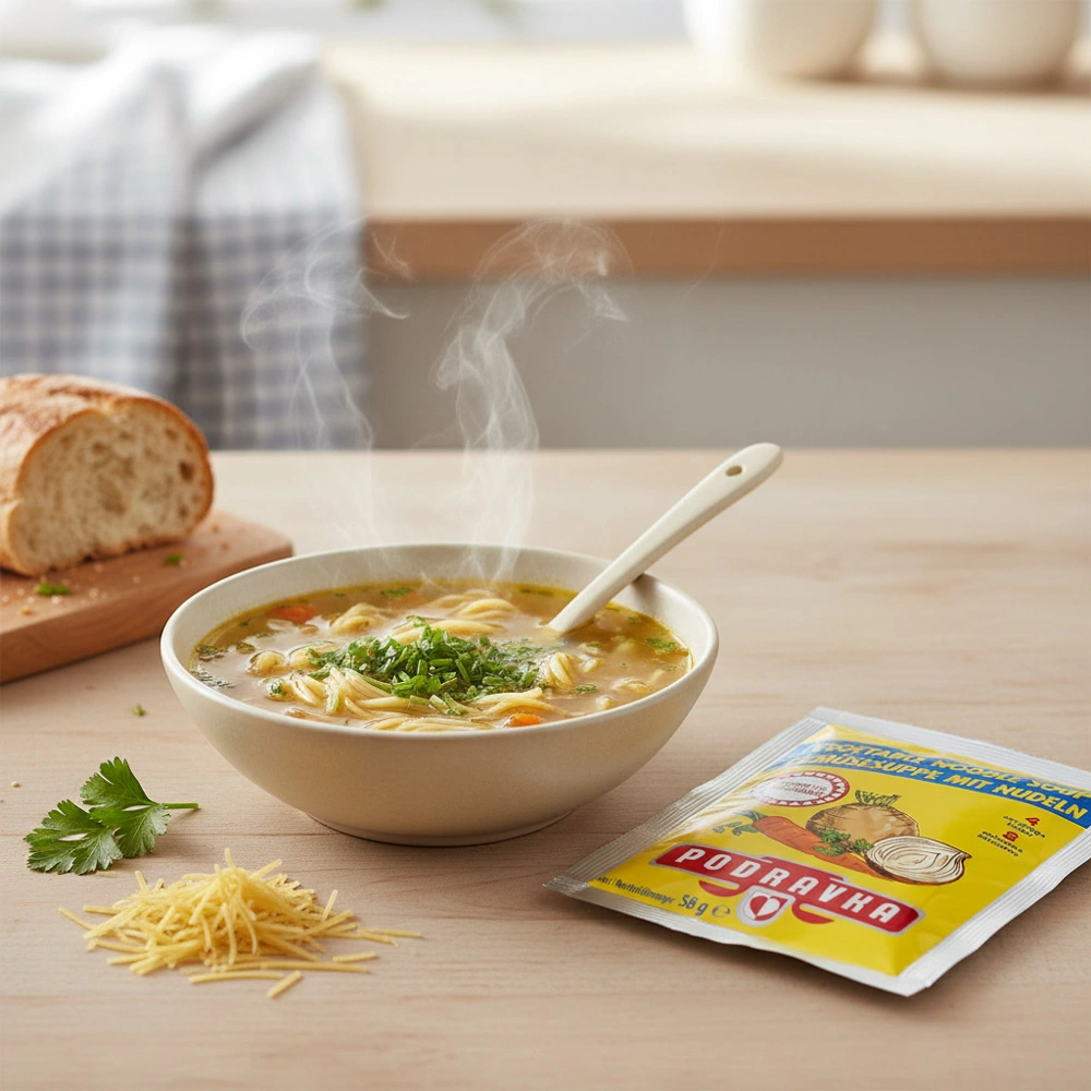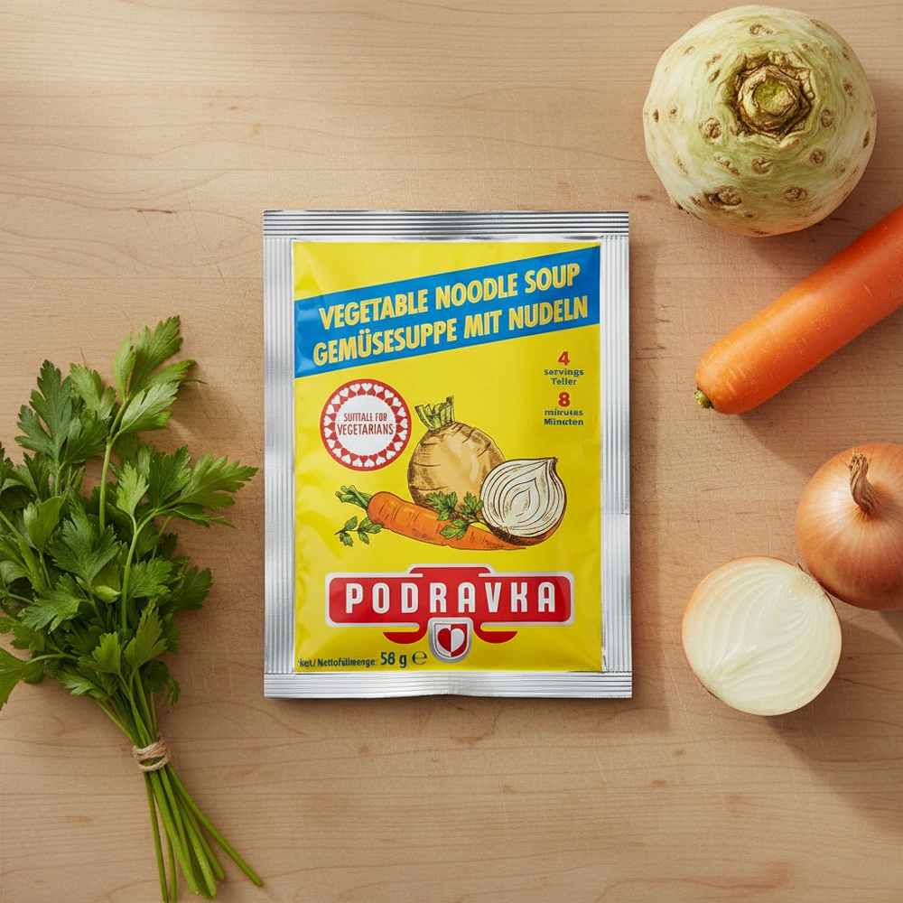 Лапша, Чеснок, Морковь, Сельдерей, Укроп, Пальмовый жир, Йодат калия, Кукурузный крахмал, Усилитель вкуса мононатрий глутамат, Лук, Специи, Ароматизатор, Петрушка, Соль, Сахар, Дрожжевой экстракт, Помидоры, Красная паприка, Инозинат динатрия