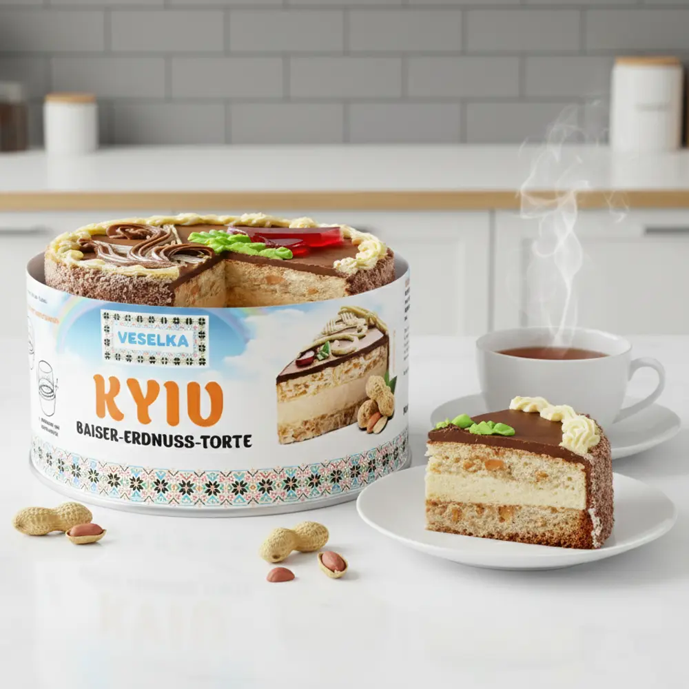 Очень вкусный Киевский торт! Хрустящее безе, нежный крем и арахис отлично сочетаются между собой. В меру сладкий, ароматный, каждый кусочек тает во рту. Купила сразу два!