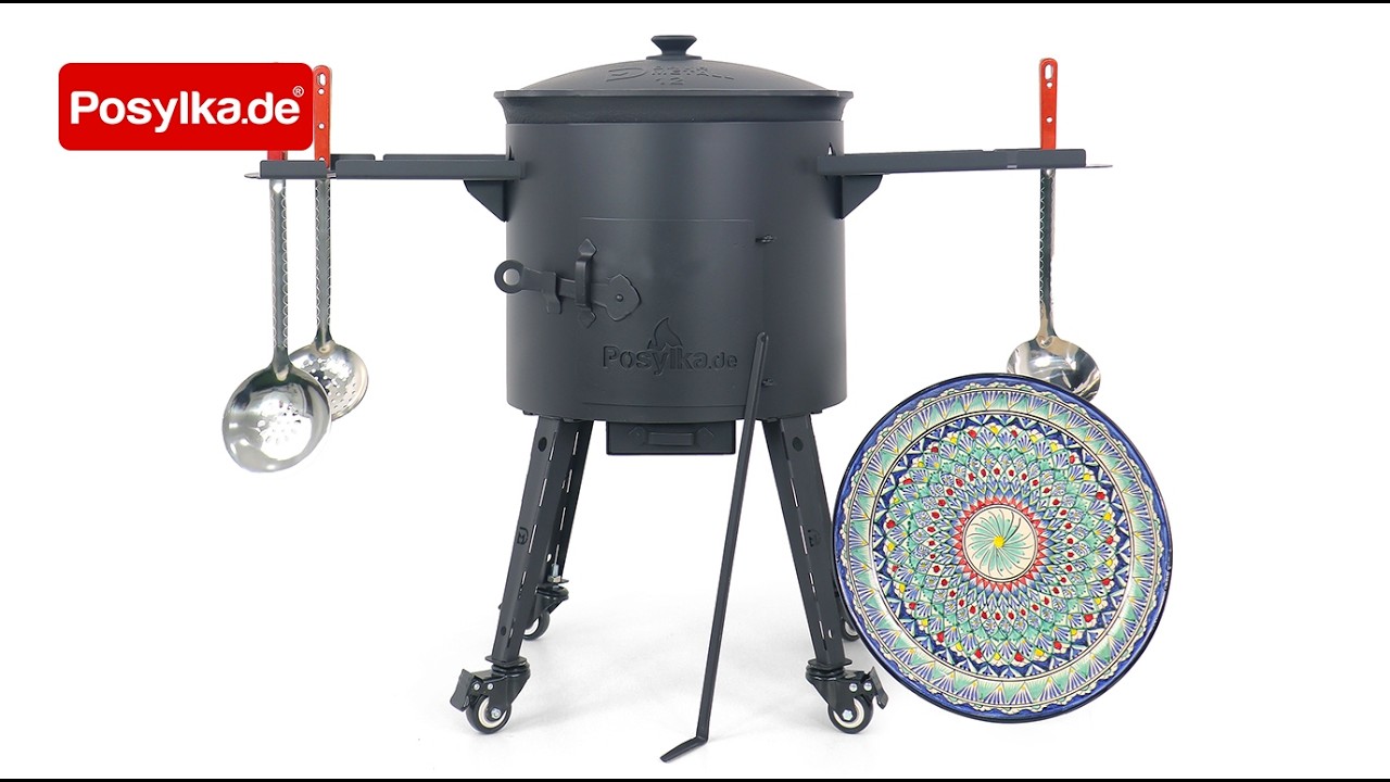Учаг печь Ø 40 см + чугунный казан 12 л, плоское дно, колёса, столики + кухонные принадлежности, узбекский чугунный казан для гриля и плова