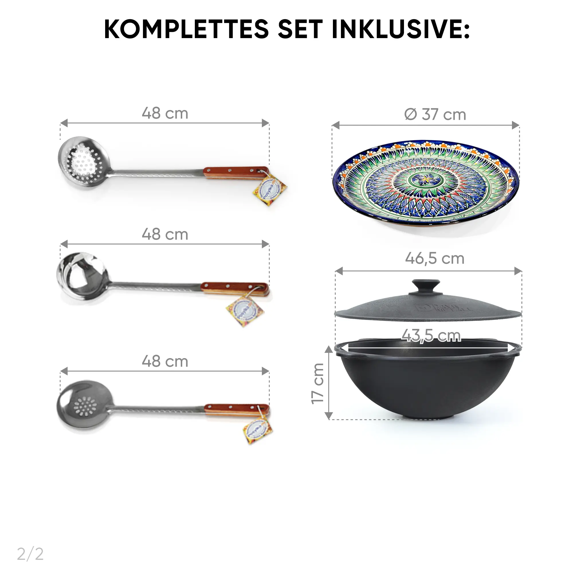 Крышка: 1 шт., Ручка: 1 шт., Кочерга 41 см, Ролики: 4 шт., Автоматический диспенсер для зубочисток, Учаг Ø 44 см, Плита стальная для печи КазаноFF, Столик для учага: 2 шт., Казан 16 л, Ø 46,5 см, Шумовка узбекская для плова, 48 см, Шумовка узбекская для плова, глубокая, 48 см, Поварёшка узбекская для плова, 48 см, Ляган Ø 37 см: 1 шт.