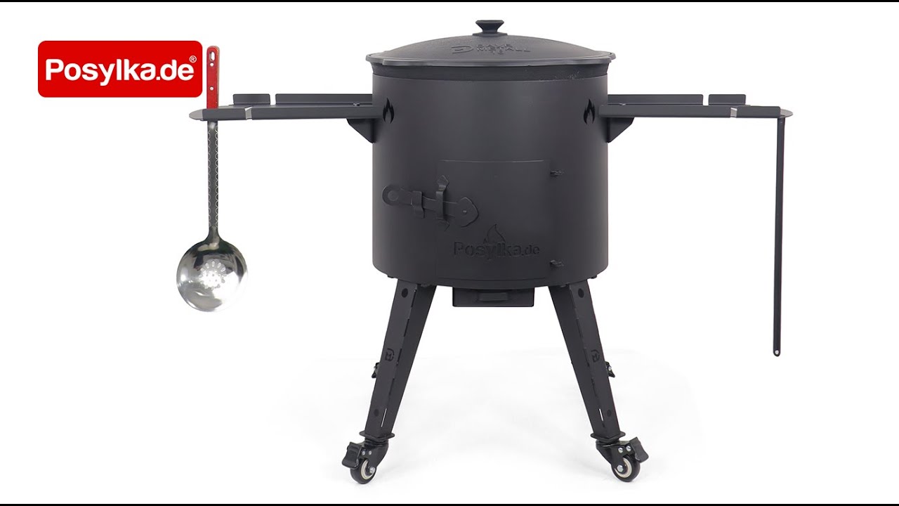 Учаг печь Ø 44 см + чугунный казан 16 л, плоское дно, колёса, столики + кухонные принадлежности, узбекский чугунный казан для гриля и плова