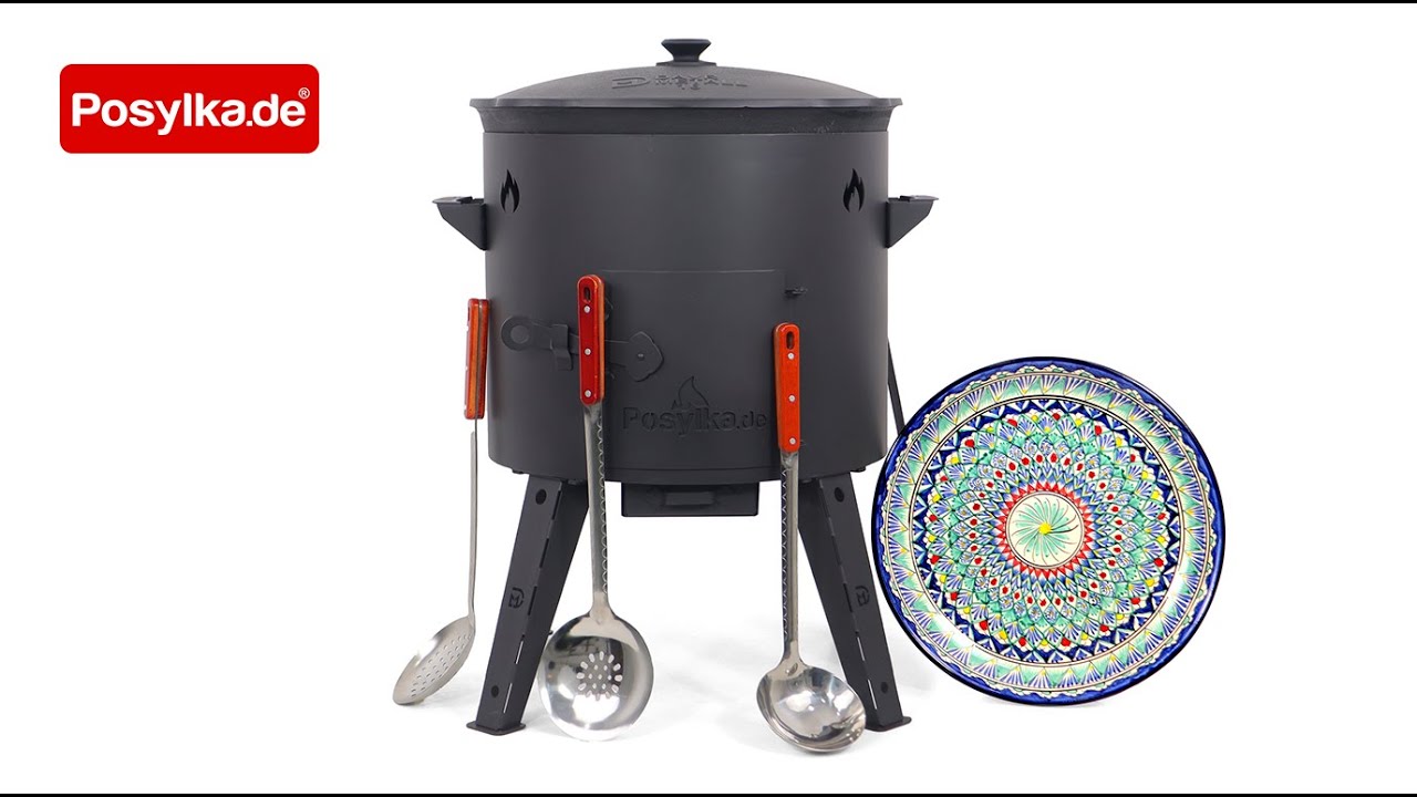 Учаг печь Ø 44 см + чугунный казан 16 л, плоское дно + кухонные принадлежности, узбекский чугунный казан для гриля и плова