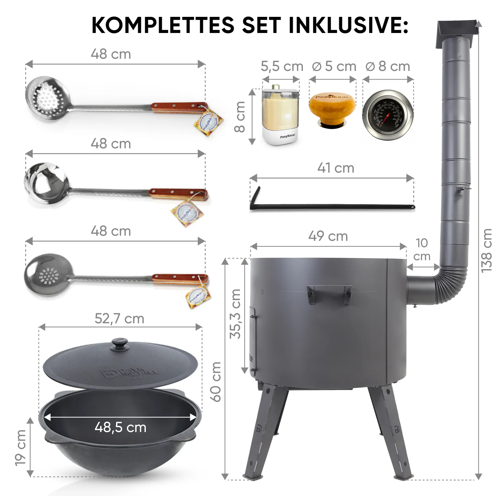 Учаг печь Ø 49 см + чугунный казан 22 л, Ø 52,7 см, круглое дно + кухонные принадлежности, узбекский чугунный казан для гриля и плова