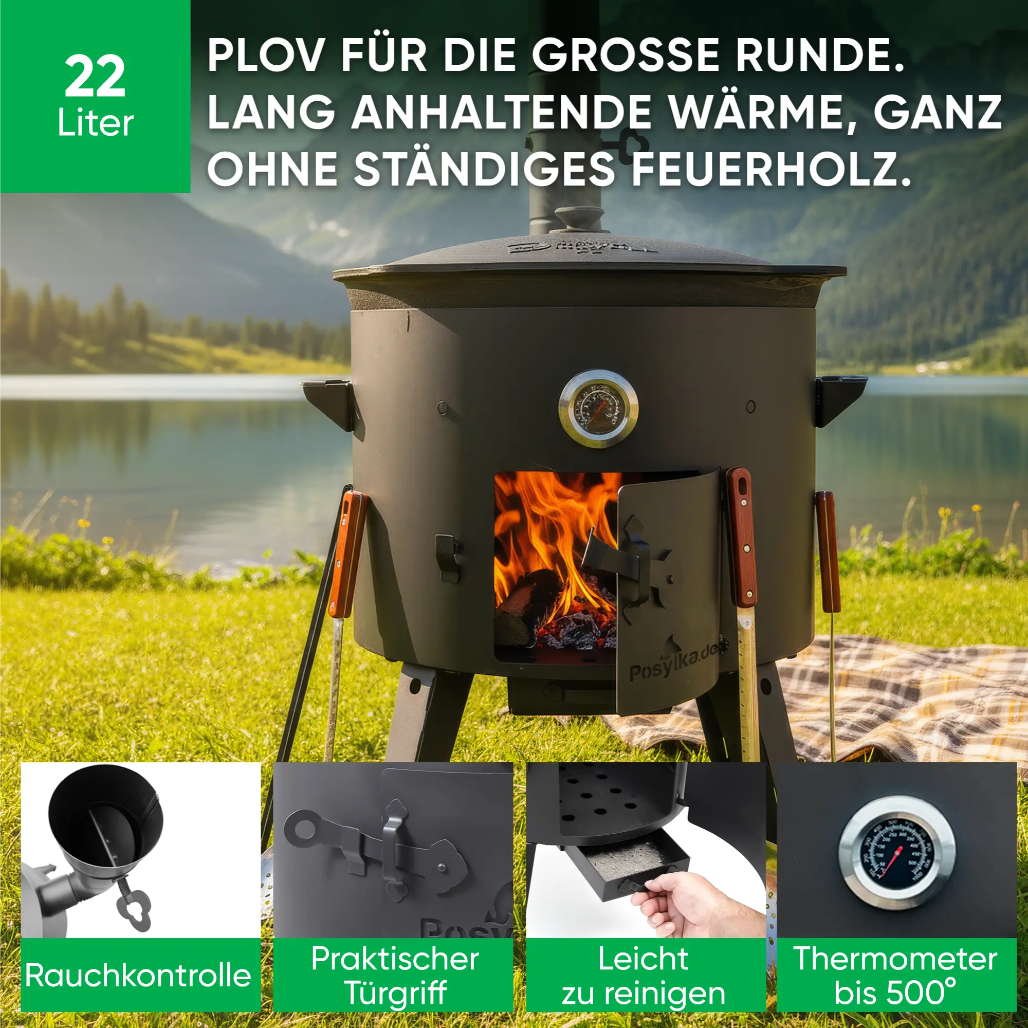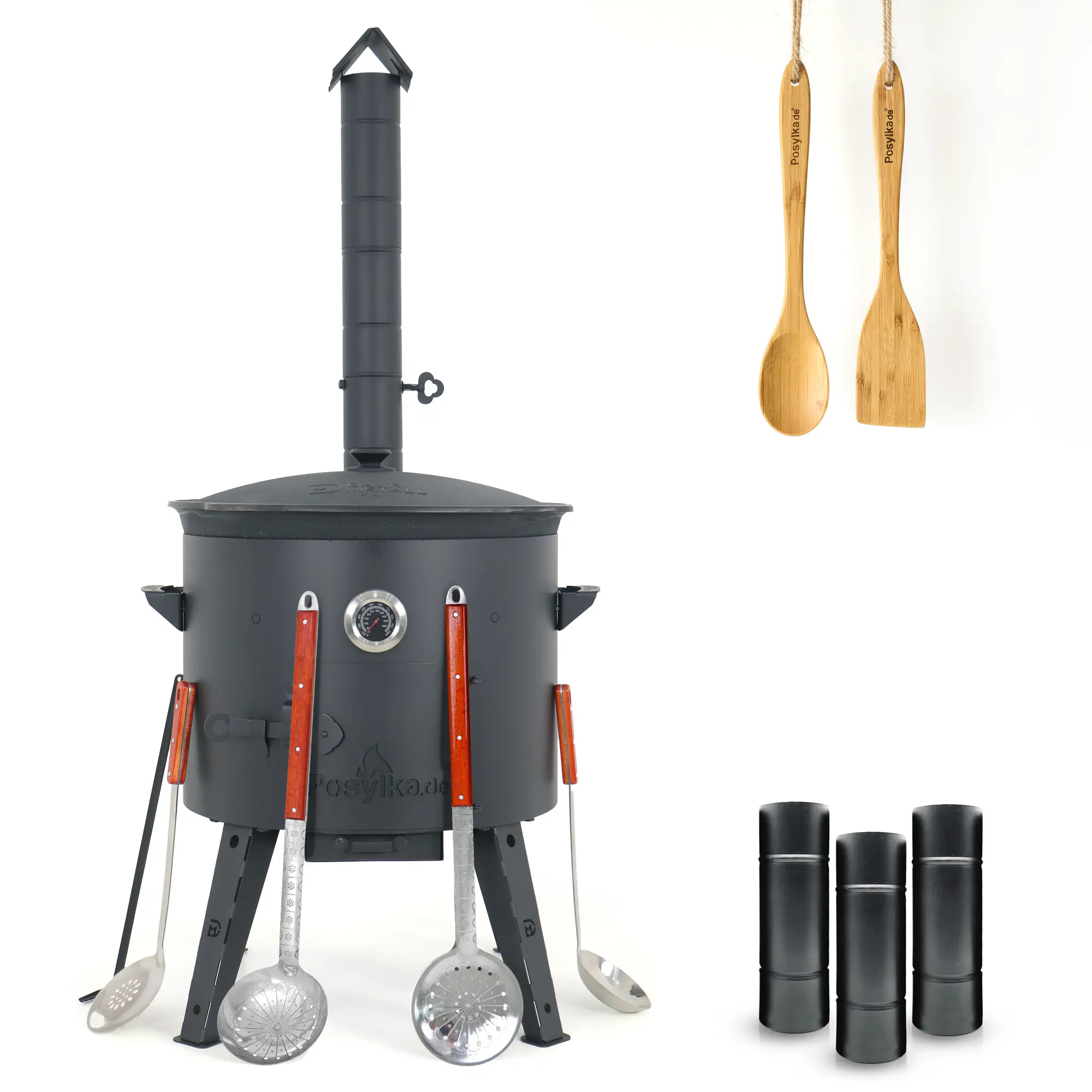 Учаг печь Ø 49 см + чугунный казан 22 л, Ø 52,7 см, круглое дно + кухонные принадлежности, узбекский чугунный казан для гриля и плова