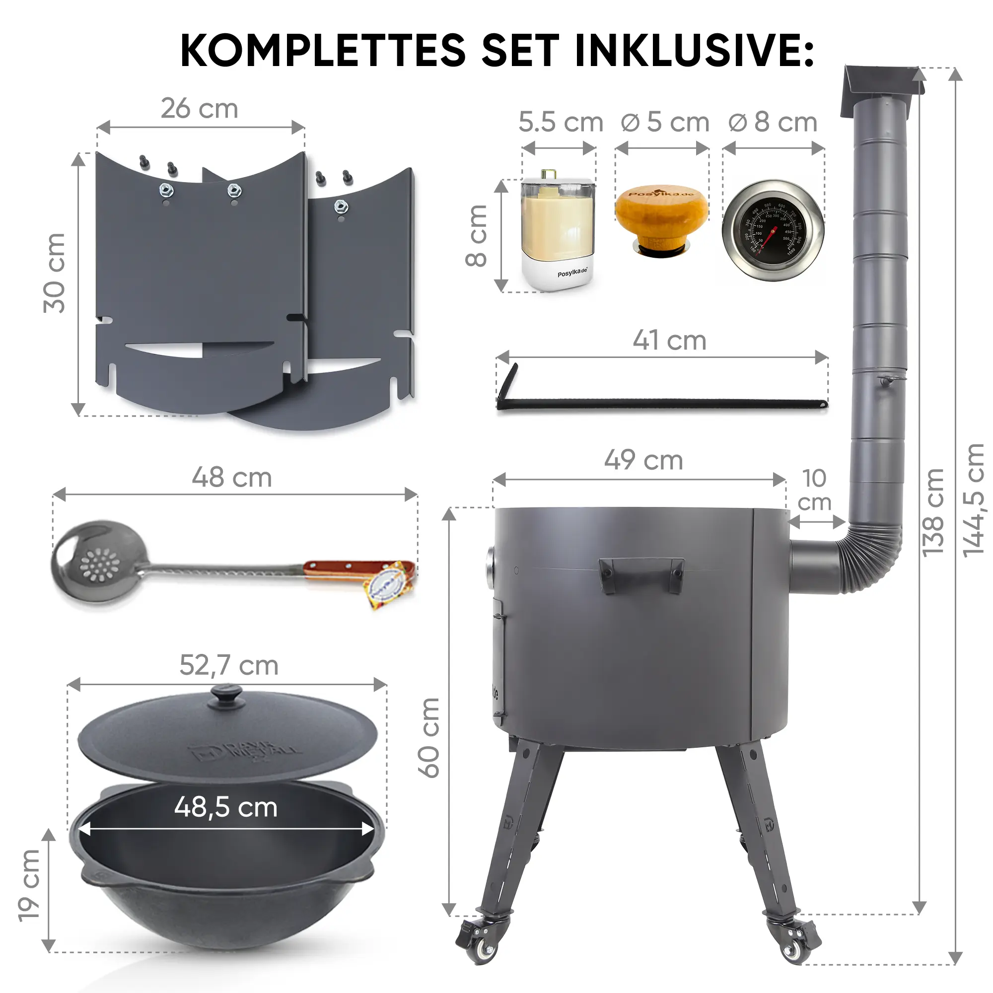 Учаг печь Ø 49 см + чугунный казан 22 л, круглое дно + кухонные принадлежности, узбекский чугунный казан для гриля и плова