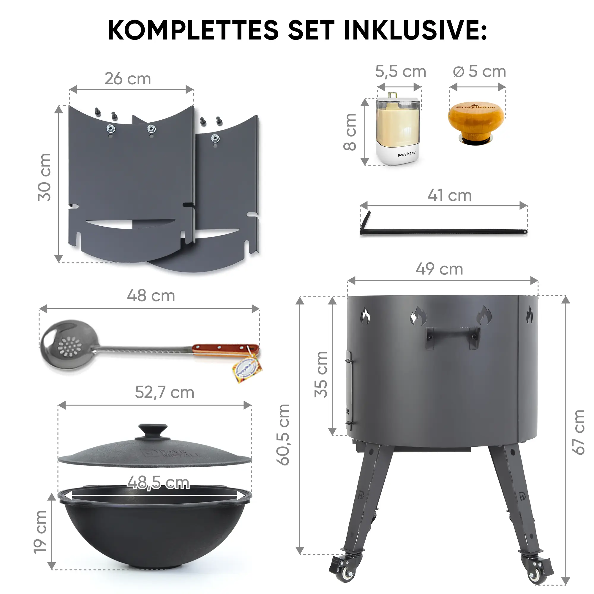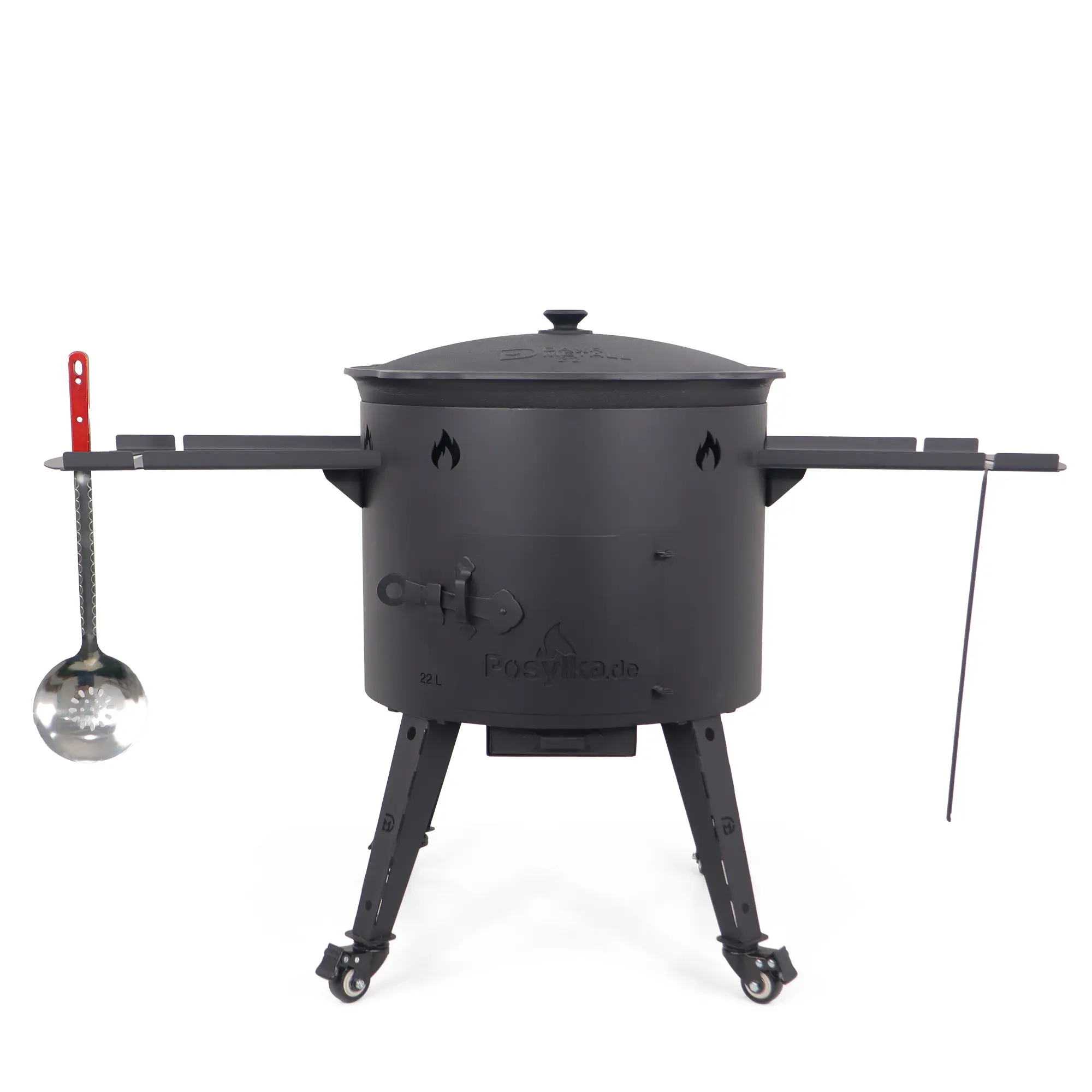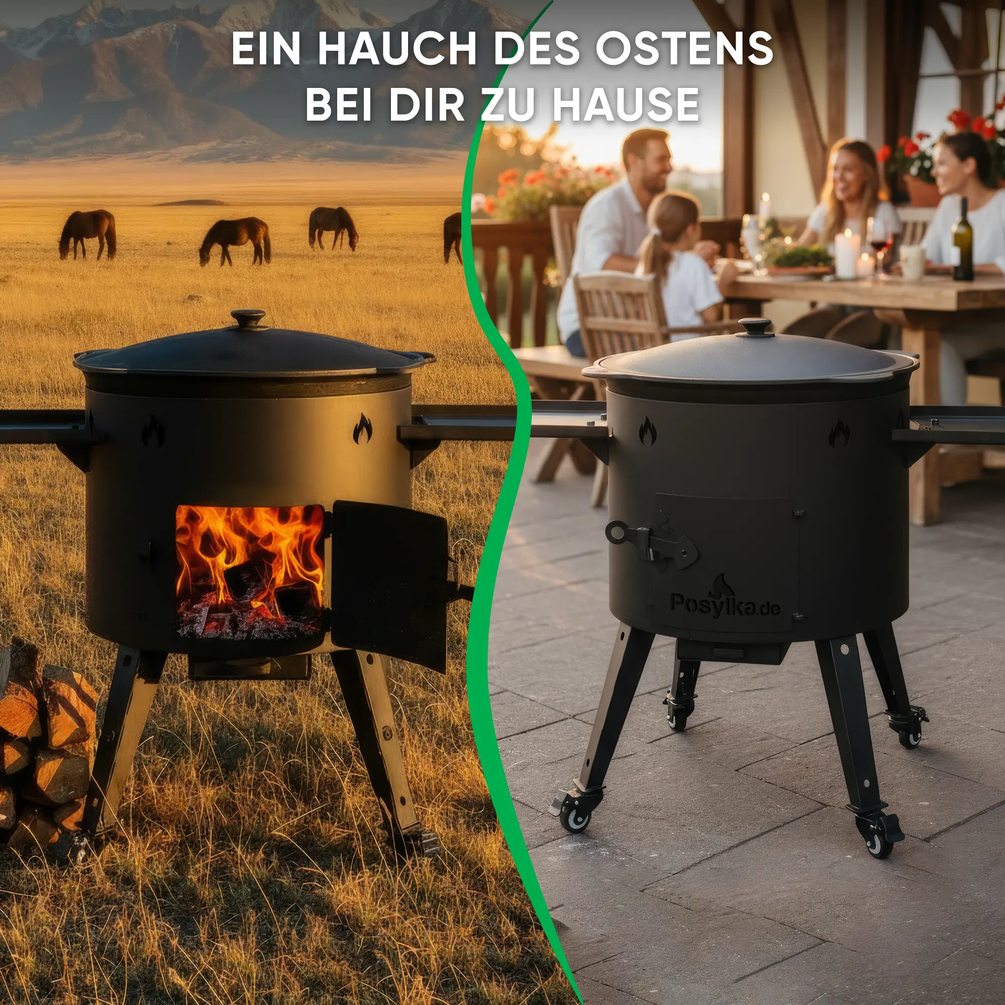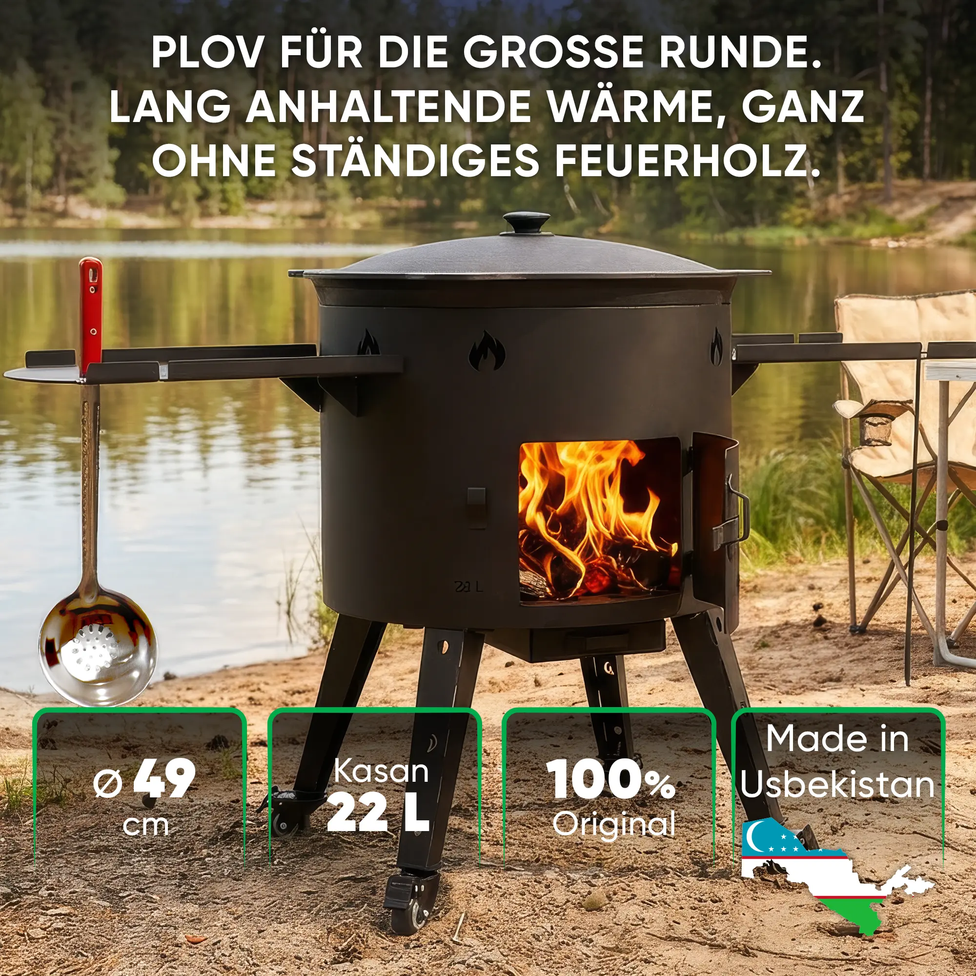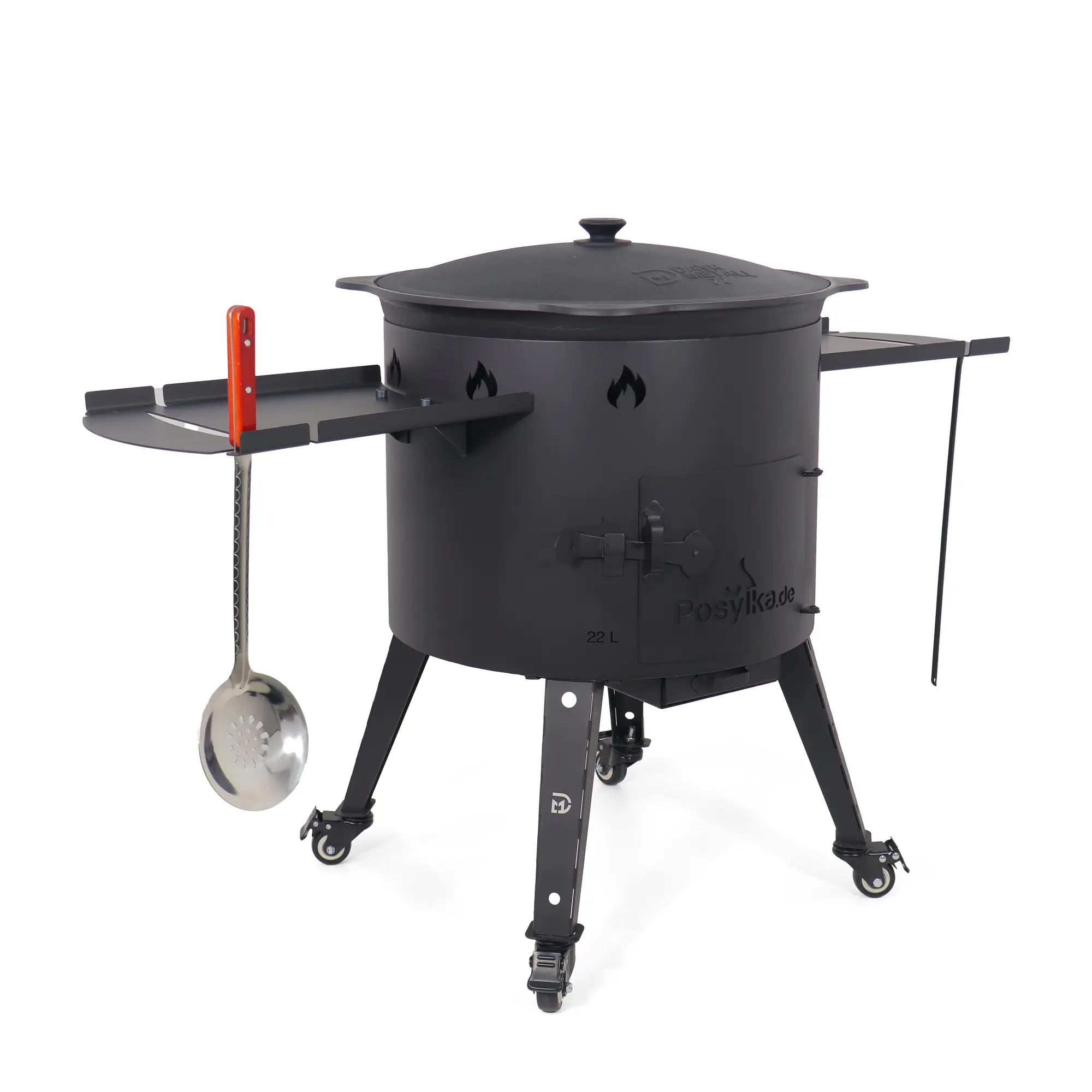Учаг печь Ø 49 см + чугунный казан 22 л, плоское дно, колёса, столики + кухонные принадлежности, узбекский чугунный казан для гриля и плова
