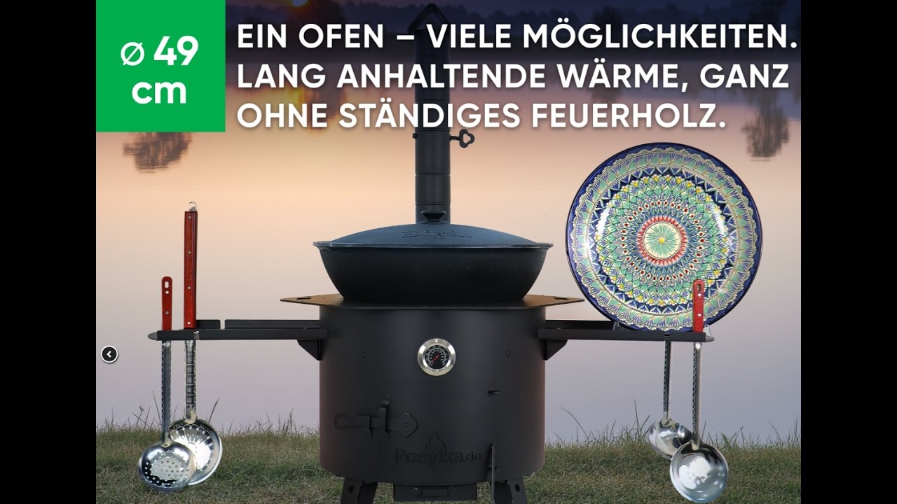 Учаг печь Ø 49 см + чугунный казан 22 л, плоское дно + кухонные принадлежности, узбекский чугунный казан для гриля и плова