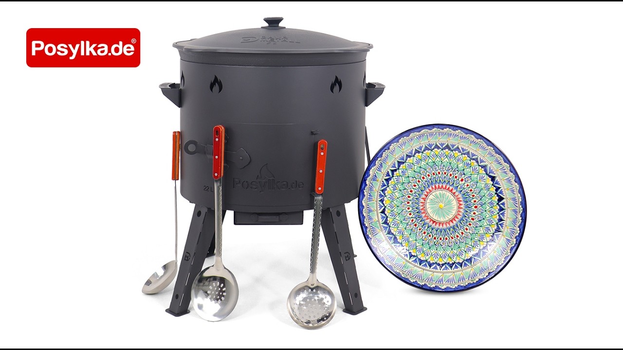 Учаг печь Ø 49 см + чугунный казан 22 л, плоское дно + кухонные принадлежности, узбекский чугунный казан для гриля и плова