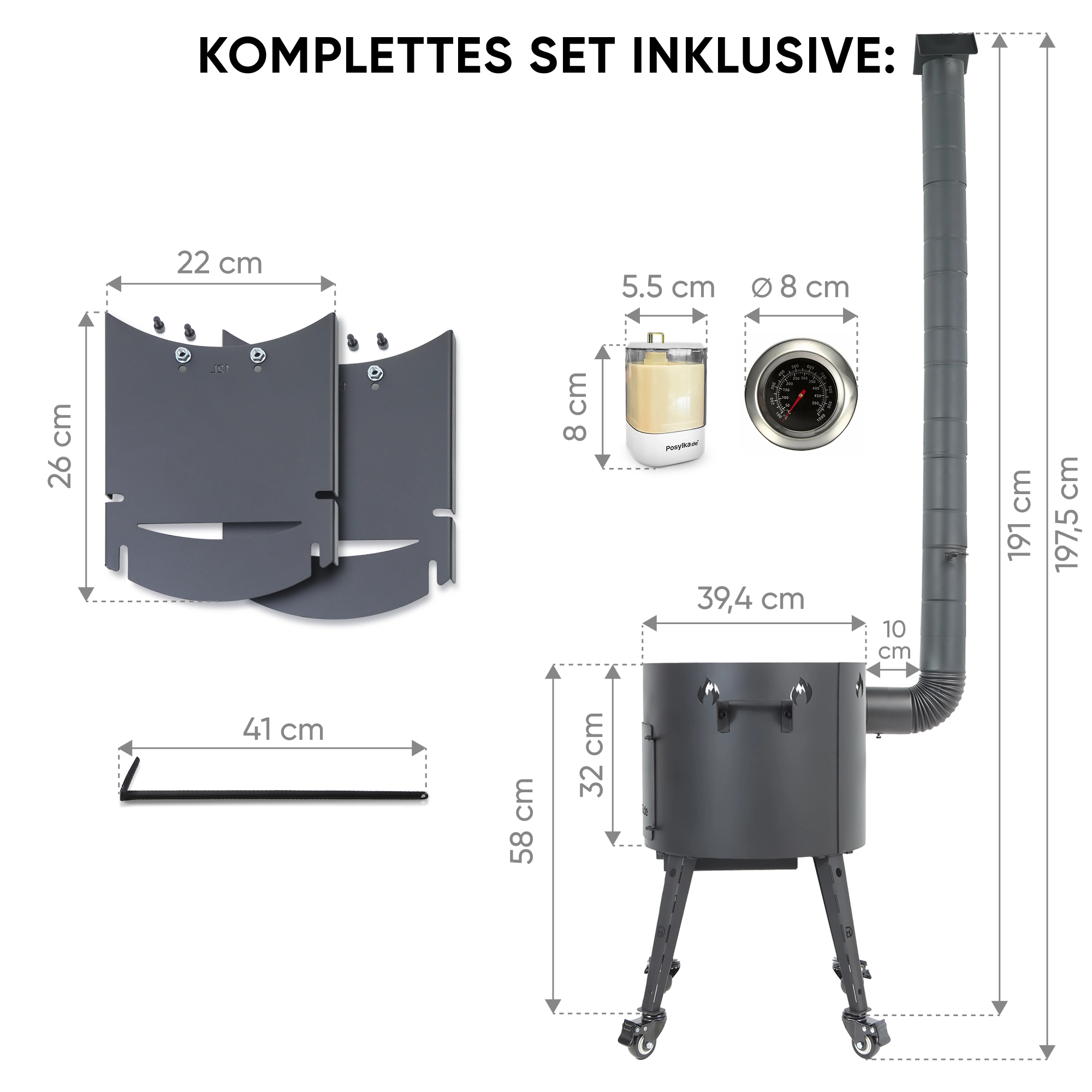 Кочерга 41 см, Ролики: 4 шт., Термометр, Трубка-удлинитель, Автоматический диспенсер для зубочисток, Учаг Ø 40 см, Столик для учага: 2 шт.