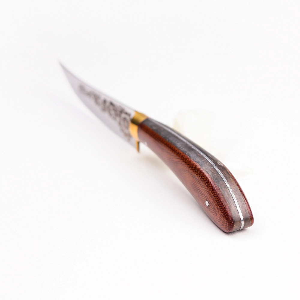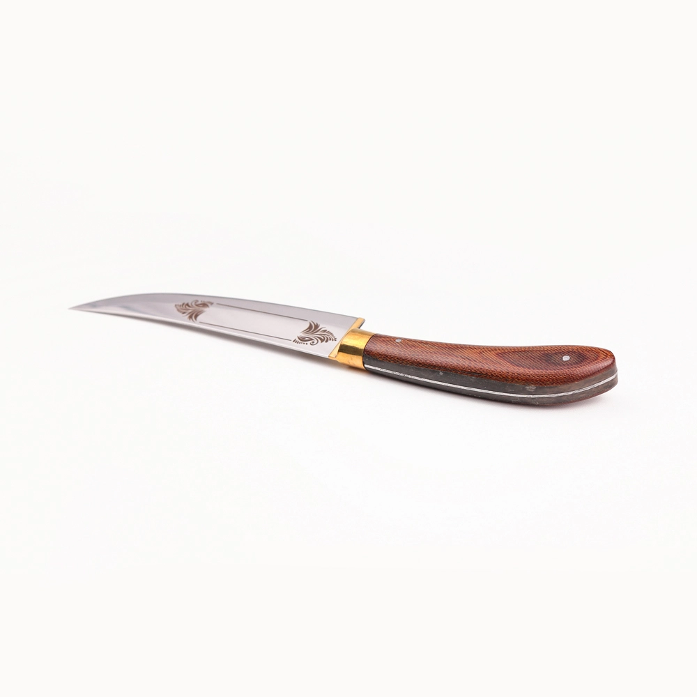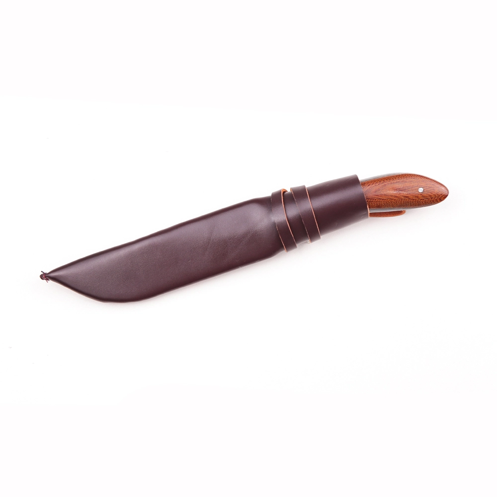 Рукоять из текстолита устойчива к влаге, не боится перепадов температуры и надежно лежит в ладони. Коричневый цвет подчеркивает традиционный характер пчака и гармонирует с блеском стального клинка.
