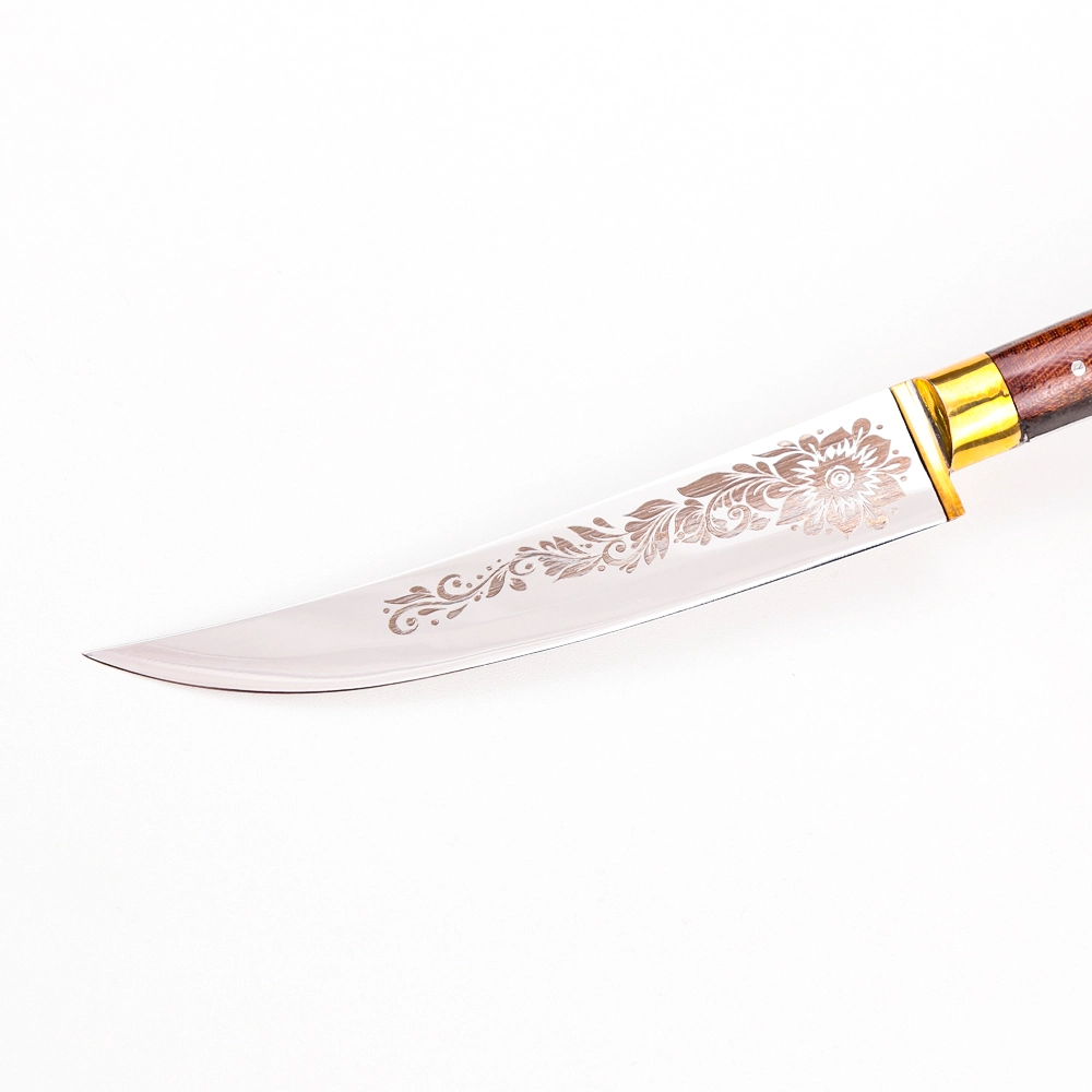 Нож поставляется в чехле, что удобно для хранения и транспортировки, в том числе на природу и в поход. Пчак произведен в Узбекистане и относится к коллекции узбекских ножей, сохраняя аутентичный внешний вид и практичность в современном использовании.